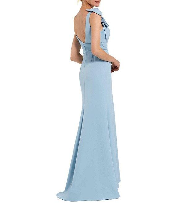 From Ieena for Mac Duggal, this dress features: A-line silhouette v-necklinesleevelessbow shoulder detailfully linedcenter back zipper closure approx. 62.5" length from shoulder to hempolyesterspot cleanImported.
