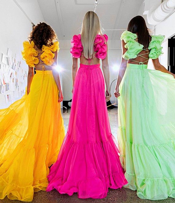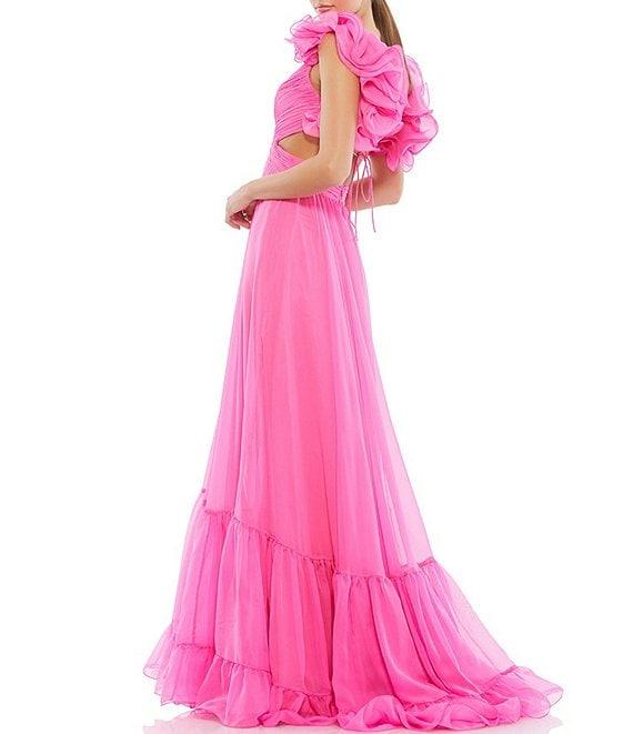 Ieena Mac Duggal Chiffon V-Neck Sleeveless Cut-Out Strappy Back Detail Tiered Ruffle Hem Gown