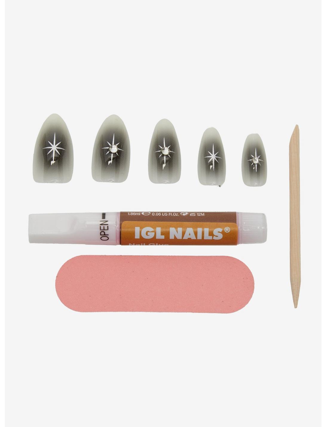 Sparkle bright with a new mani! This press on nail set features grey starburst designs, plus star and rhinestone detailing in the center. Comes with 30 inclusive sized nails, 1 tube of nail glue, glue tabs, nail file, cuticle stick and alcohol wipe.30 nailsABS plasticGlue, glue tabs, nail file, cuticle stick & alcohol wipe includedImported