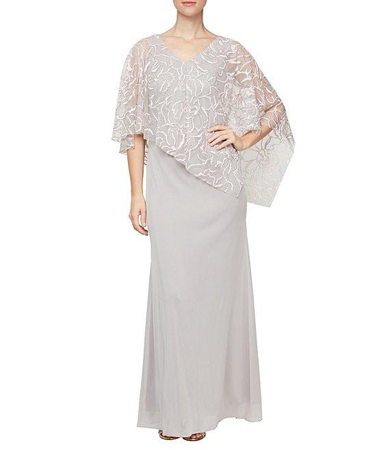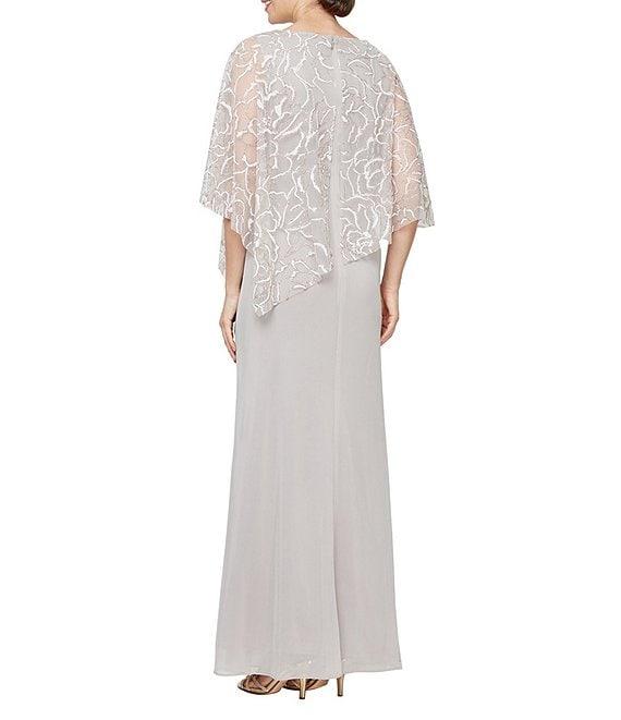 Ignite Evenings 3/4 Sleeve Asymmetrical Glitter Mesh Capelet V-Neck Jersey Gown