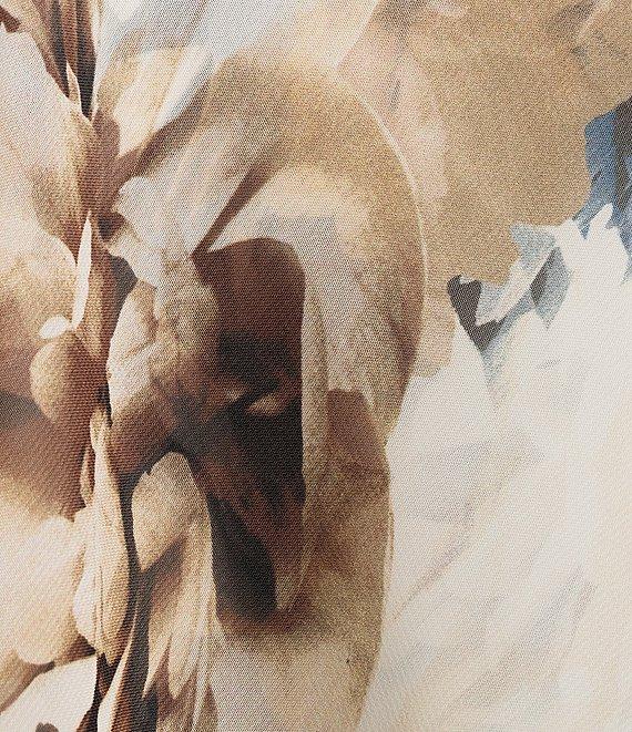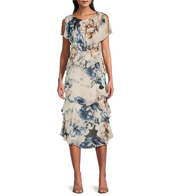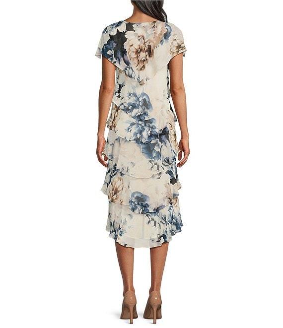 Ignite Evenings Chiffon Embellished Shoulder Cap Sleeve Crew Neck Printed Tiered Shift Midi Dress