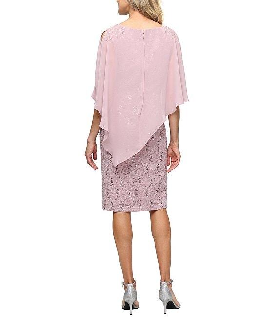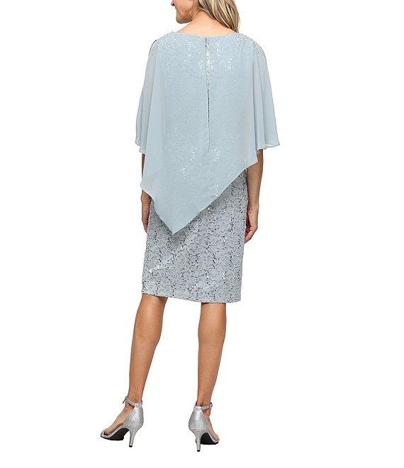 From Ignite Evenings, this dress features: Sequin lace fabrication Sheath silhouette Crew neckline Short sleeves Capelet overlay Embellished shoulders Zip back closure Approx. 36.75" length Polyester/spandex Hand wash cold Imported.