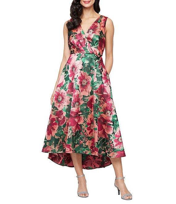 From Ignite Evenings, this dress features: Jacquard fabrication V-neckline Sleeveless A-line silhouette Lined Pockets Floral print High-low hem Zip back closure Approx. 50.5" in center back length Polyester Hand wash Imported.
