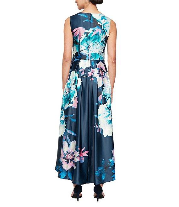 From Ignite Evenings, this dress features:Satin fabricationSquare necklineSleevelessLinedPocketsFloral printHigh-low hemZip back closureApprox. 54" in center back lengthPolyester/spandexHand washImported.