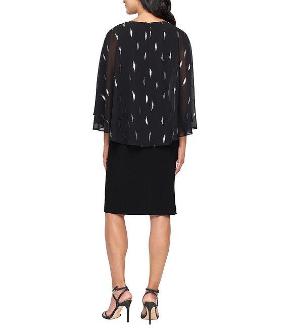 From Ignite Evenings, this dress features: Matte jersey and chiffon fabrication Scoop neckline Capelet overlay sleeves Sheath silhouette Foil printed overlay Matte jersey skirt Lined Center back zipper closure Approx. 36" in length Polyester Hand wash Imported.