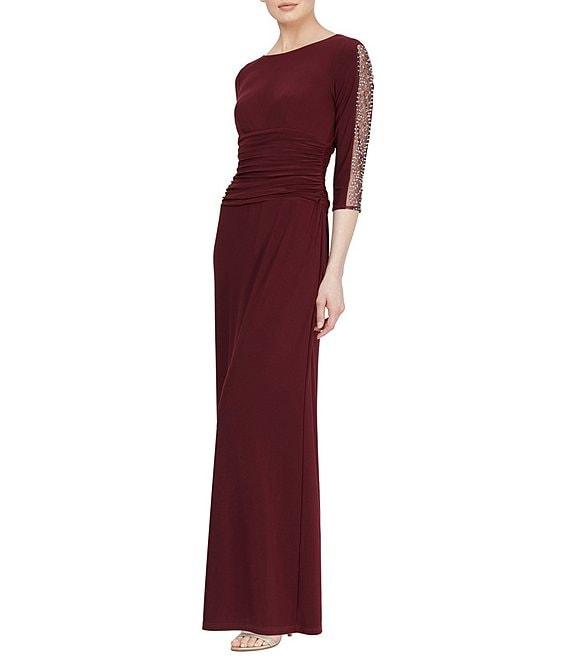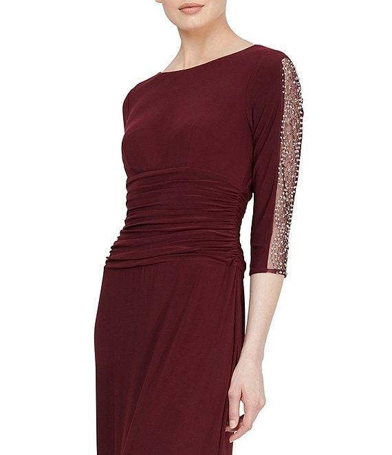 Ignite Evenings Petite Size Boat Neck 3/4 Embellished Sleeve Ruched Waist Sheath Dress
