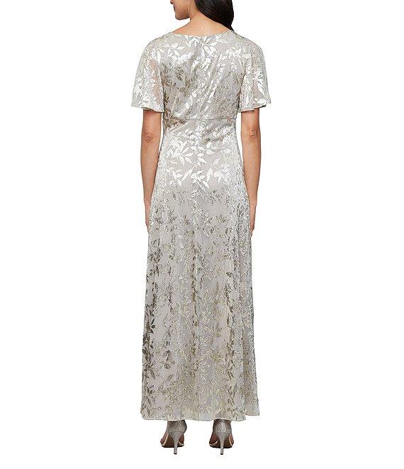 From Ignite Evenings, this dress features: Metallic knit fabrication Scoop neckline Short flutter sleeve Bodre dress Foil print Empire waist silhouette Lined Center back zipper closure Approx. 50" in length Polyester/metallic Hand wash/dry flat Imported.
