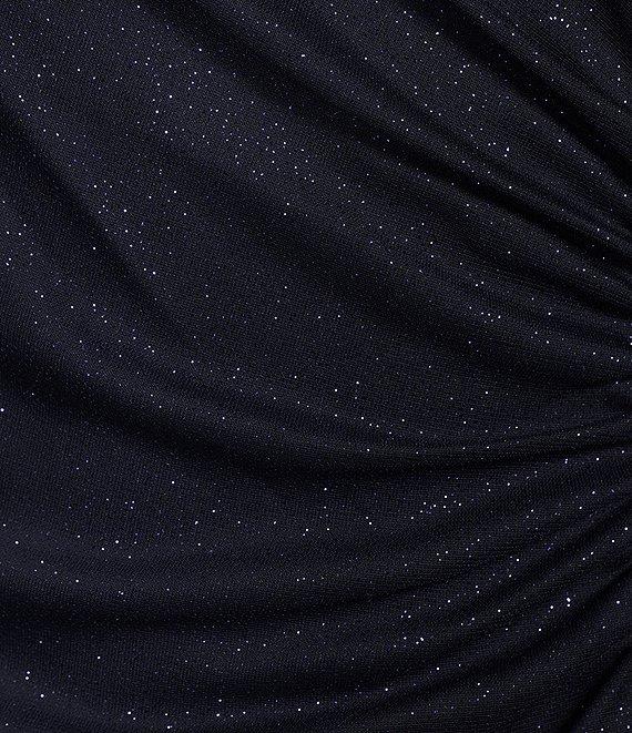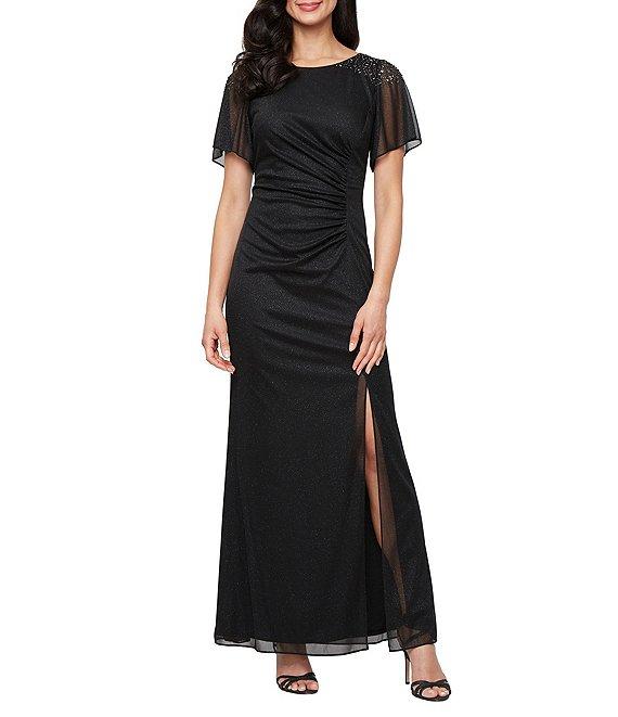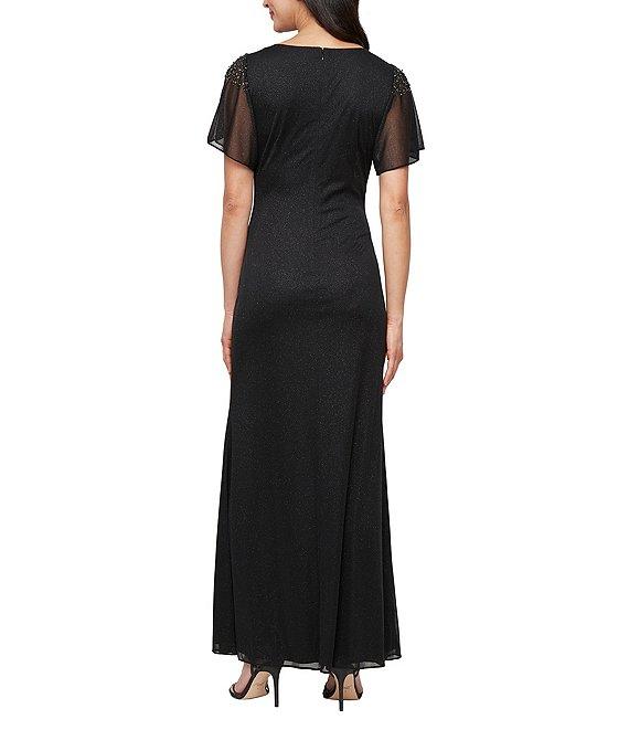 From Ignite Evenings Petite, this dress features: Glitter sheer matte jersey fabrication Boat neckline Short flutter sleeves Embellished detail at shoulders Front slit Lined Center back zipper with hook and eye closure Approx. 53" in length Hand wash Imported.