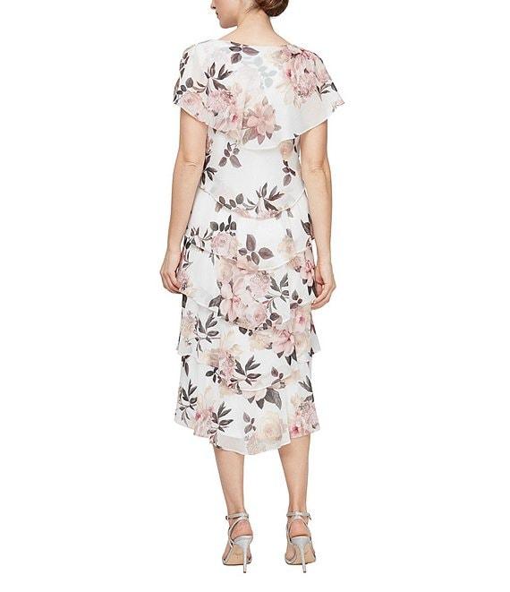 From Ignite Evenings Petite, this dress features: Chiffon fabrication Boat neckline Short capelet sleeves Lined Tiered details Floral print Zip back closure Approx. 43" in center back length Polyester Hand wash Imported.