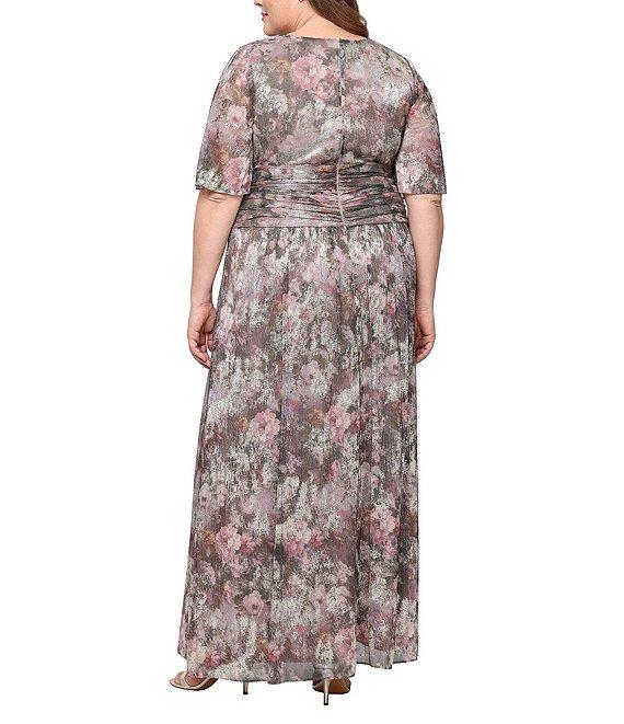 From Ignite Evenings Plus, this dress features: Metallic bodre fabrication V-neckline Short sleeves Lined Floral print Ruched waist Zip back construction Approx. 57.50" in center back length Polyester/metallic Hand wash Imported.