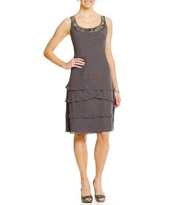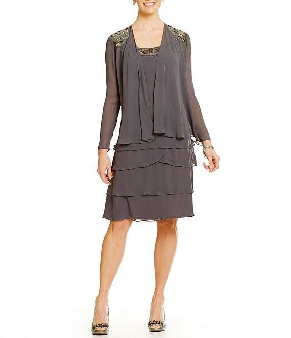 From Ignite Evenings, this jacket dress features: Jacket: open neckline long sleeves open front; no closure polyester spot clean Dress: chiffon fabrication sheath silhouette sequin trimmed scoop neckline sleeveless tiered ruffle skirt pullover construction approx. 41.25" in length polyester spot clean Imported. When choosing a size if you are in between sizes please size up.