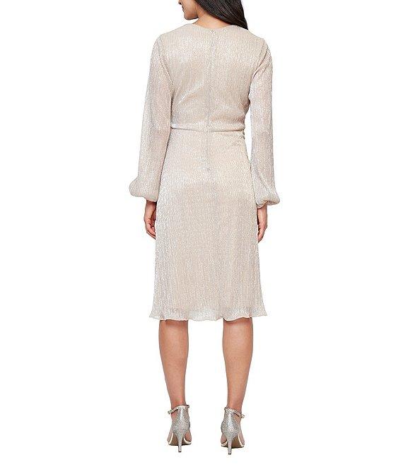 From Ignite Evenings, this dress features: Shimmer bodre fabrication Surplice neckline Long sleeves Tea length Front knot detail Lined Center back zipper closure Approx. 40.5" in length Polyester/metallic Hand wash/dry flat Imported.