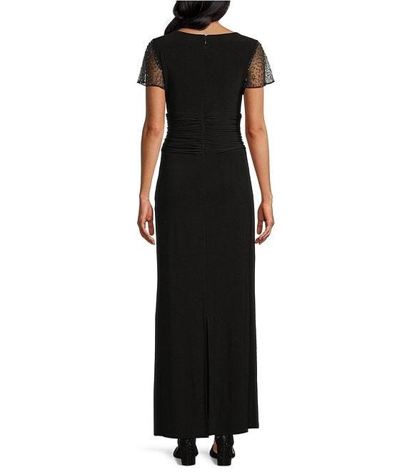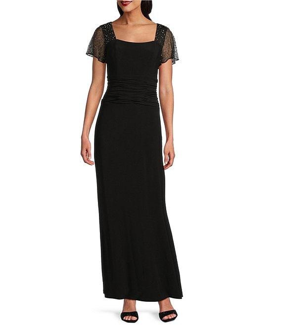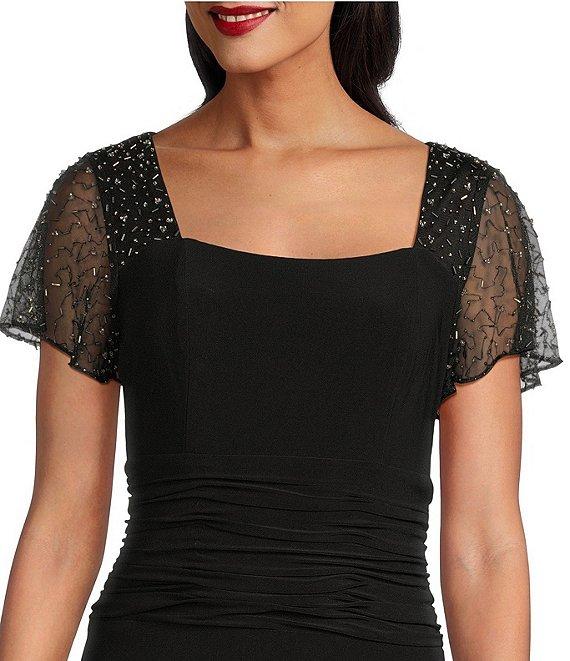 From Ignite Evenings, this dress features: Matte jersey fabrication Square neckline Short beaded flutter sleeves Sheath silhouette Lined Ruched waist Zipper closure Approx. 53.25" in length Polyester/spandex Hand wash Imported.