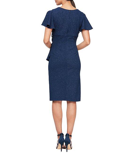 From Ignite Evenings, this dress features: Metallic knit fabrication Sheath silhouette V-neckline Short flutter sleeves Embellishment at hip Ruched Lined Center back zip, hook-and-eye closure Approx. 40.25" length Polyester/spandex Hand wash cold/flat dry Imported.