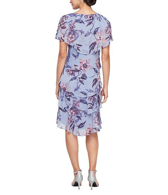 From Ignite Evenings, this dress features: Chiffon fabrication Embellished v-neckline Short sleeves Lined Tiered details Floral print Zip back closure Approx. 40" in center back length Polyester/metallic Hand wash Imported.