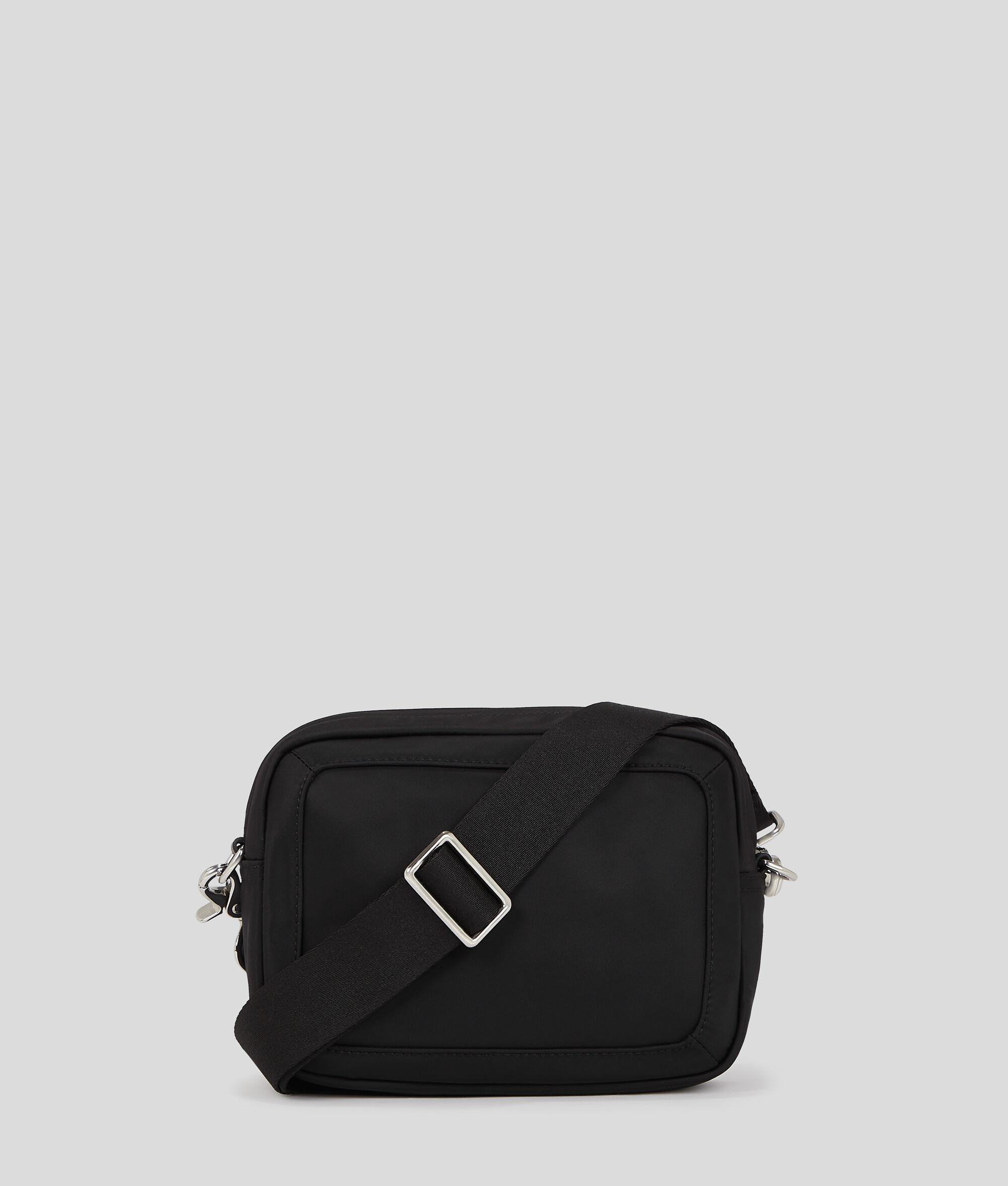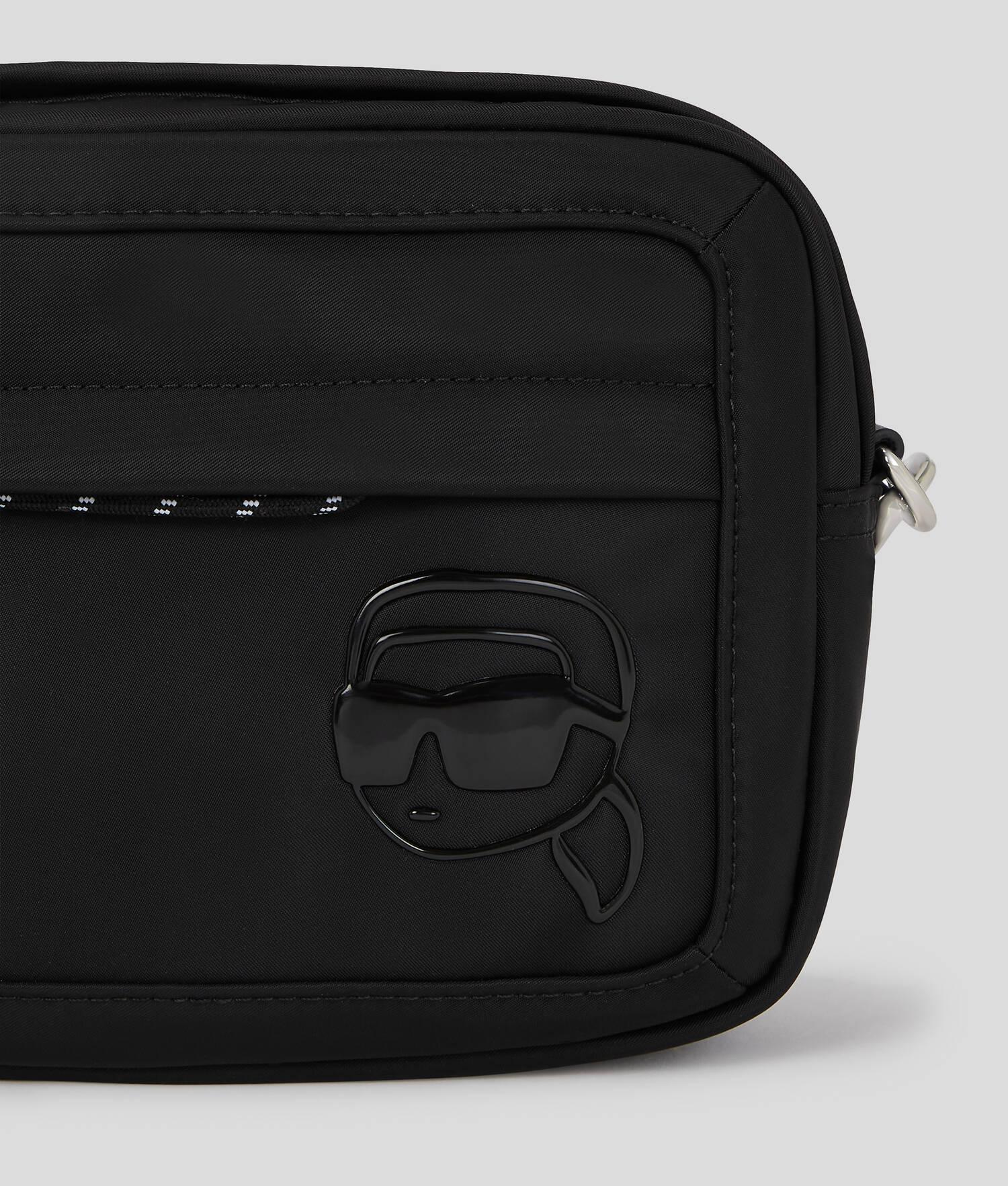 This crossbody bag seamlessly combines practicality and style. With a secure zip-top closure and an adjustable strap, it adapts effortlessly to any look. A front zipped pocket adds functionality, while tonal Ikon Karl artwork showcases the brand's signature flair.