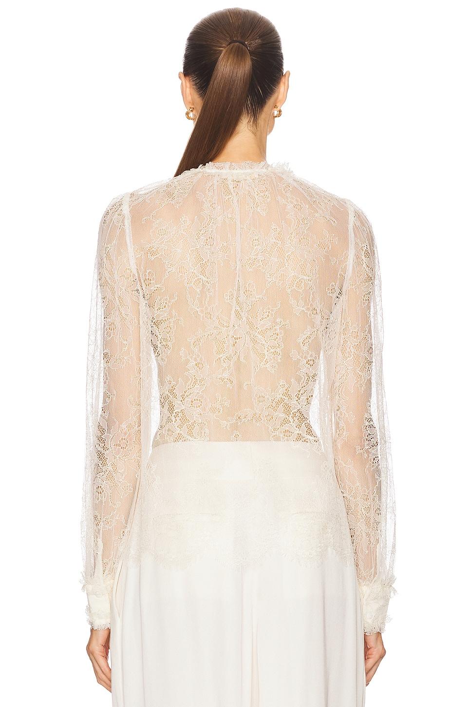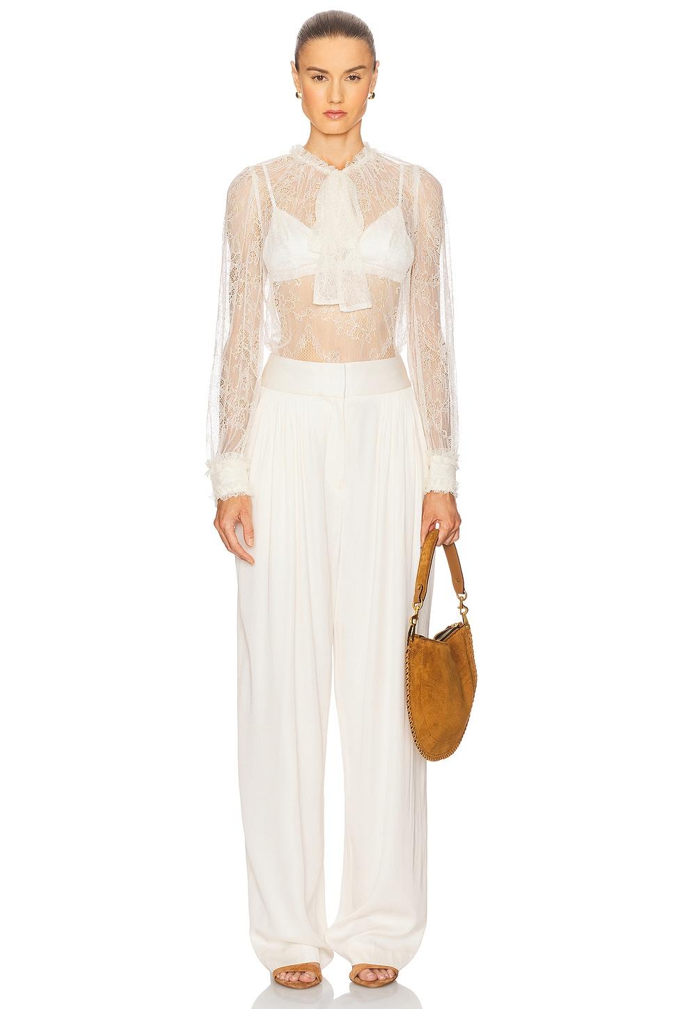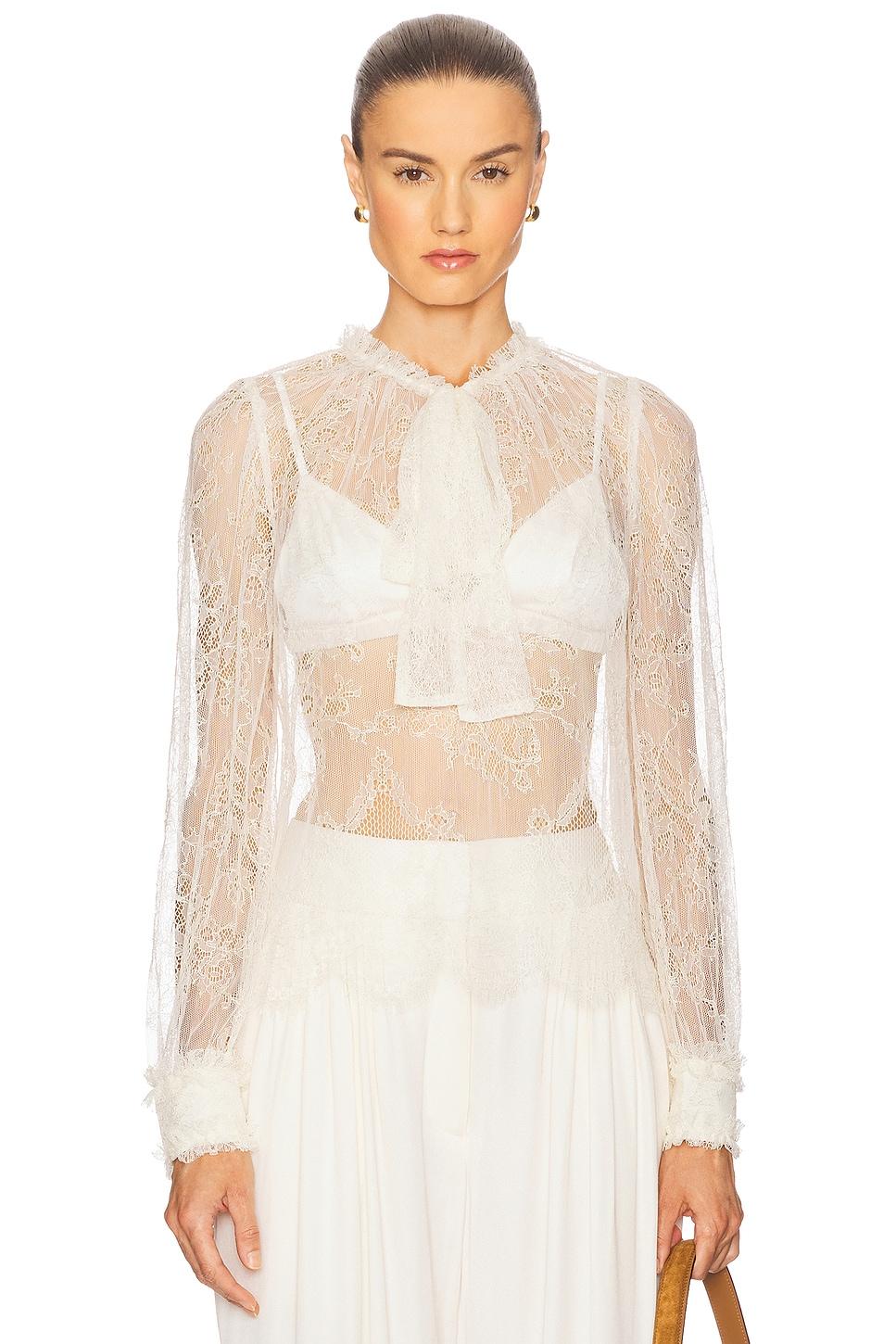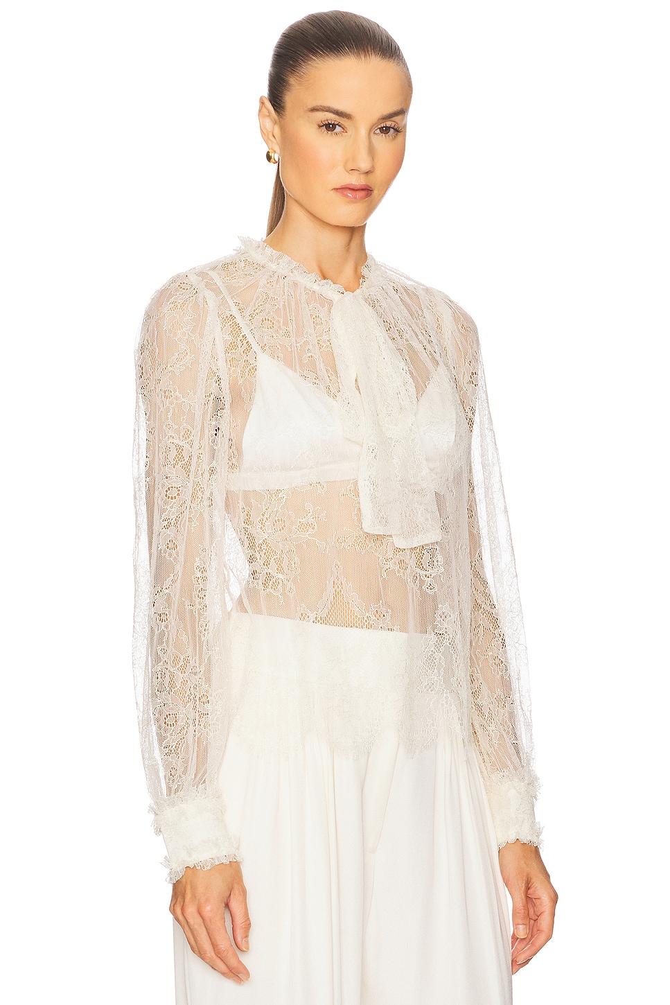 69% nylon, 31% viscose. Dry clean only. Front tie closure. Button cuffs. Lightweight lace fabric. Garment is intentionally sheer, undergarments will show through.Please note undergarment not included. Made in China. Revolve Style No. ULLA-WS476. Manufacturer Style No. PF250262.