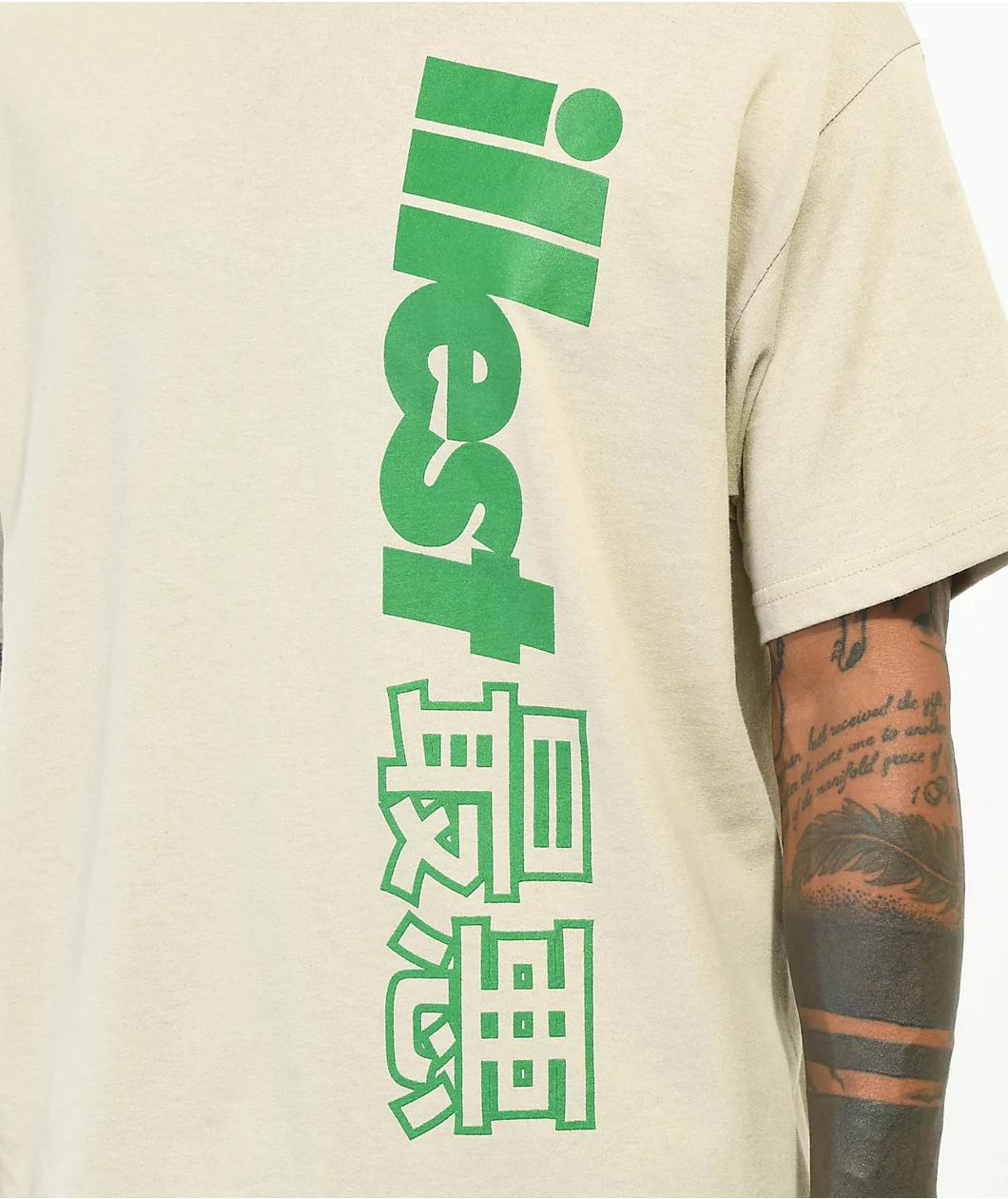 The Legend t-shirt from Illest comes in a light tan colorway and features green, screen-printed logo script vertically along the front left side. The back boasts a graphic of a street racing car along with more green logo script above and below, perfect f