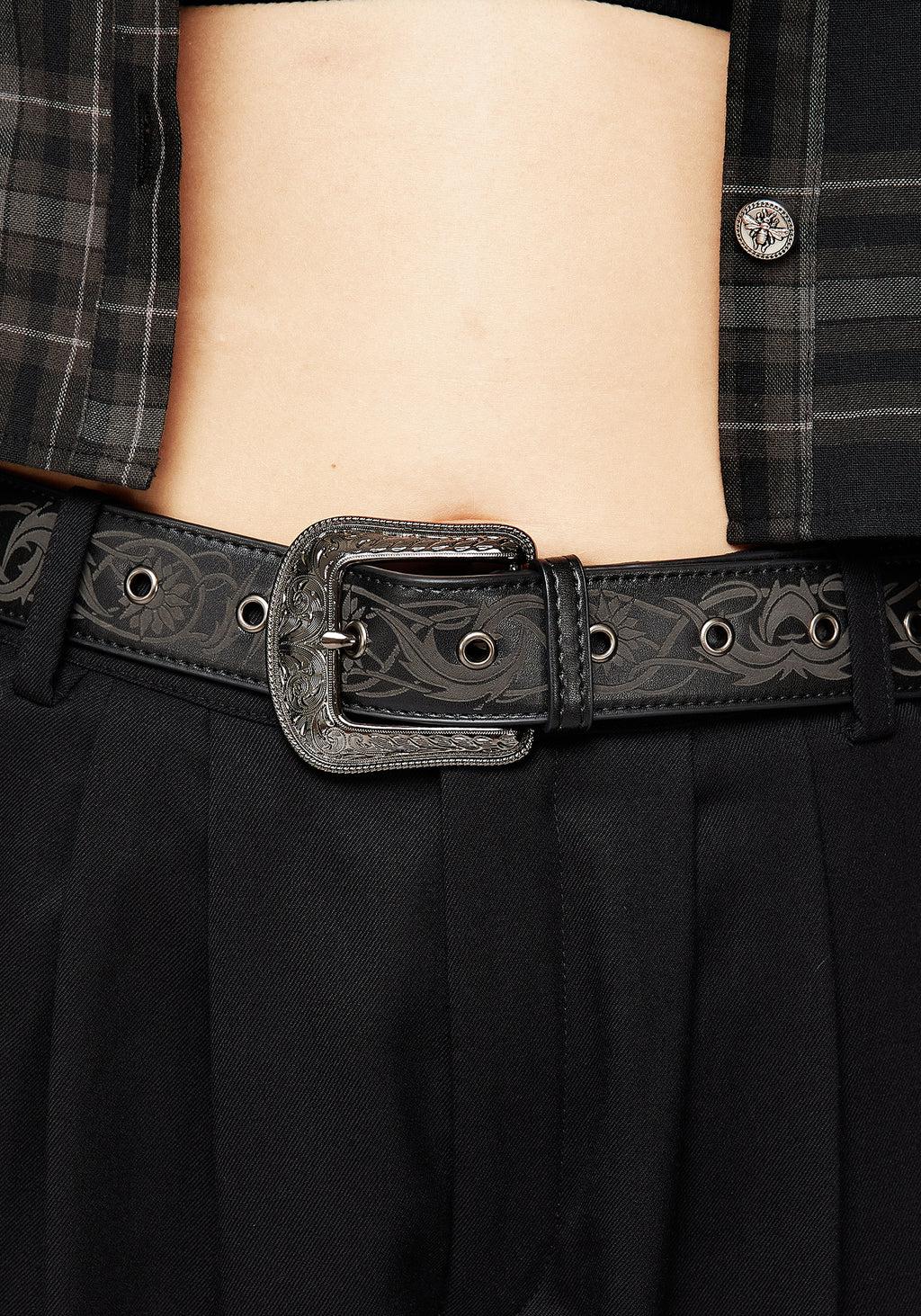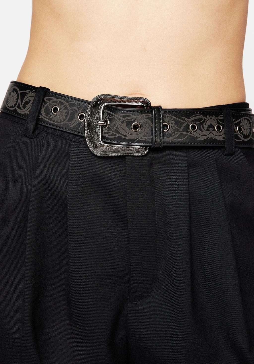 In love & light- Black debossed buckled waist belt - Loops through belt loops to secure & adorn your badass bottoms - Silver belt buckle features Celtic inspired design for an elegant touch - Celtic floral pattern debossed into sturdy PU leather fabrication for a long-lasting & stand-out design - Keeps your pants in place and looks cool as hell doing it - Shine bright 100% PU leather