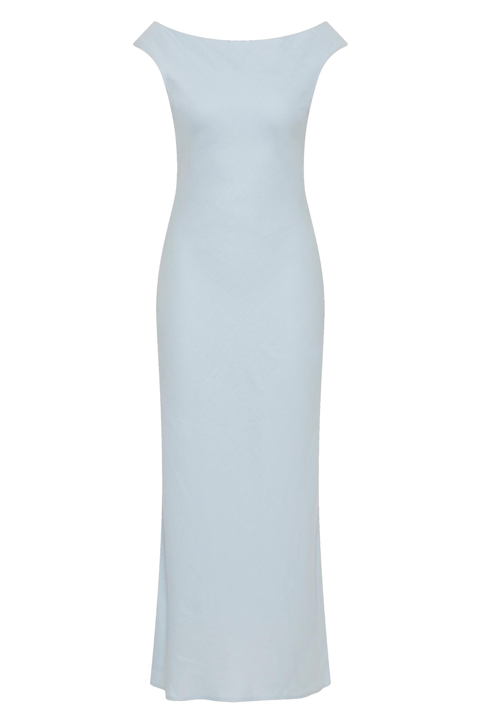 A relaxed yet refined midi dress, designed from a 100% European Flax® linen fabrication in a soft sky blue colour. With a boat-style neckline, sitting slightly off the shoulder, it is semi-fitted through the upper body before falling into a slight A-line skirt, cropping above the ankles. Style with a simple heel for day to night dressing. This style is true to size. There is no elastic woven into the fabric so it does not offer any additional stretch.