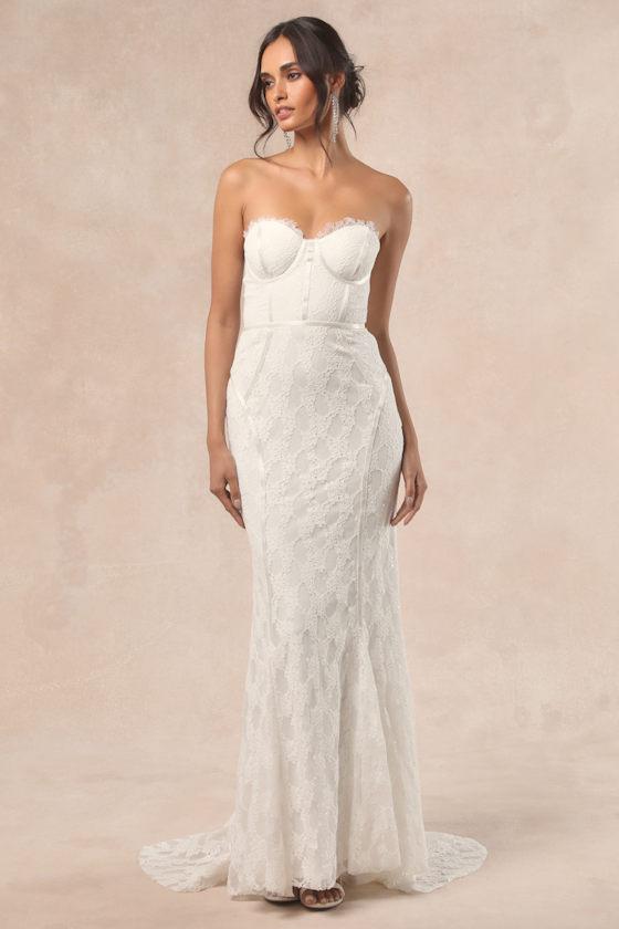 Your walk down the aisle will turn into a strut the moment you slip into this lovely lace gown that is more than ready for your big day! The strapless, bustier-inspired bodice features eyelash lace trim along the neckline, padded underwire cups, and a fitted waist. The mermaid maxi skirt features a dramatic train at the back that lends effortless elegance, while satin seam detailing throughout perfectly accentuates your figure. No-slip strip and hidden side zipper/clasp.