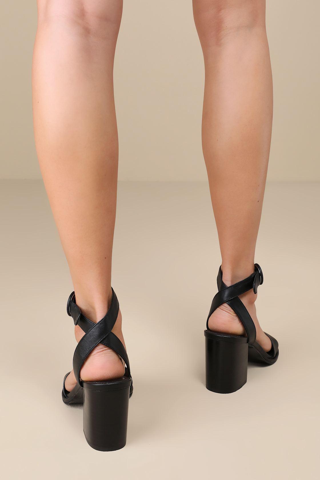 Nothing's easier than matching your favorite 'fits with the D'Amelio Footwear Imery Black Leather Ankle Wrap High Heel Sandals! Smooth genuine leather shapes these essential heels with a square footbed, a slender vamp strap, and a single sole silhouette. Wide straps sprout from the sides and wrap around the ankle to secure with a covered, circular buckle, all atop a chunky block heel.