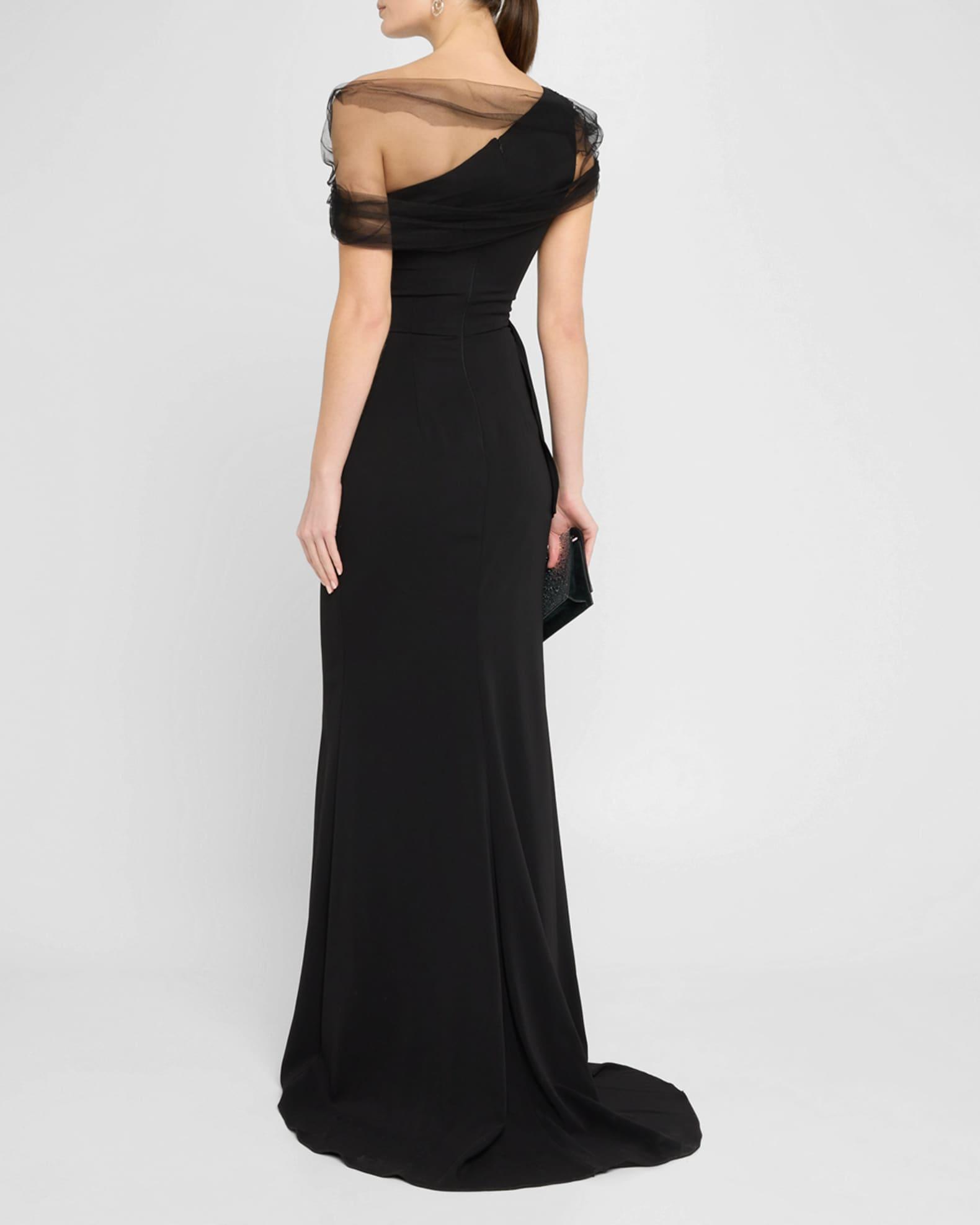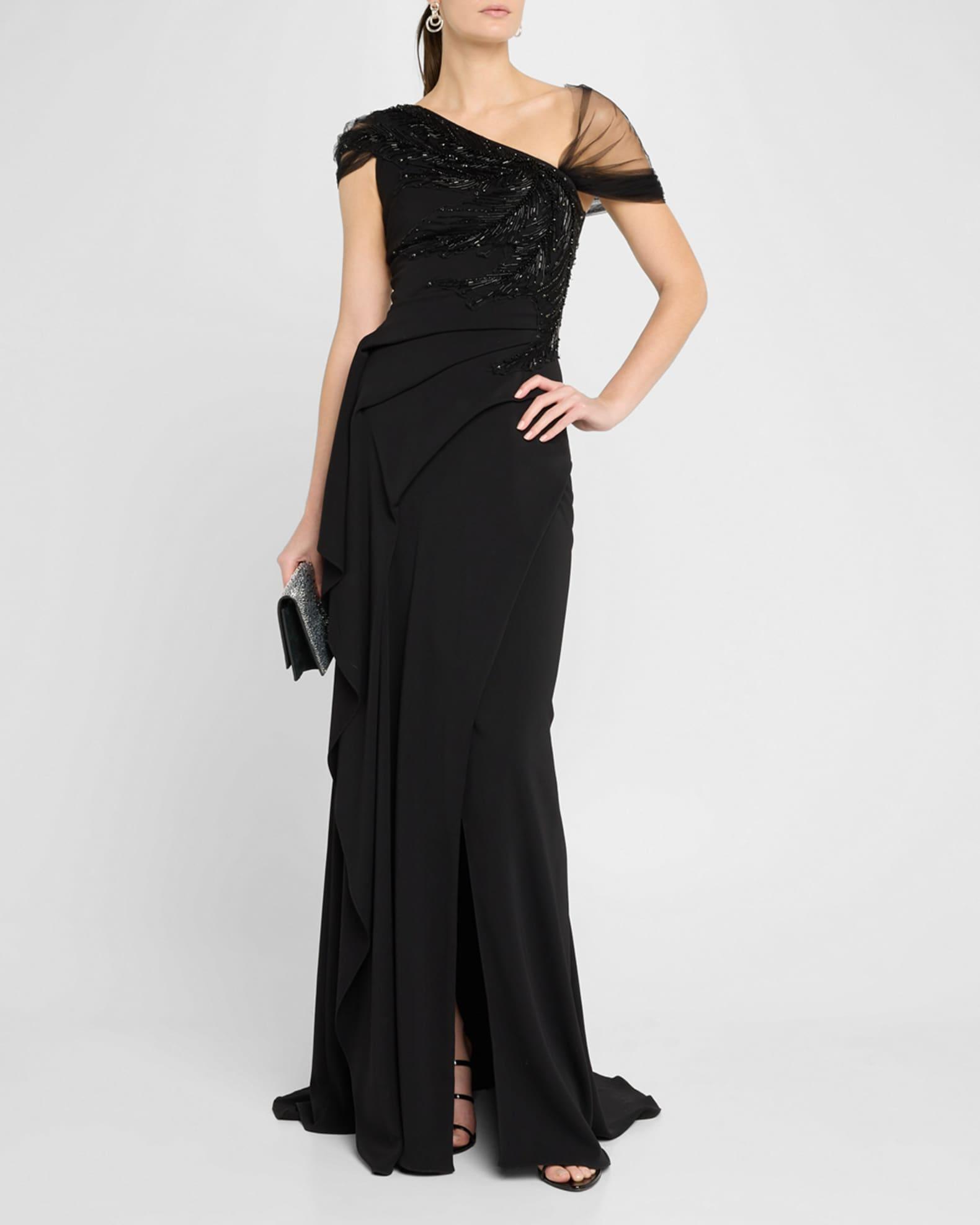 Atelier Prabal Gurung "Imogen" draped gown featuring a beaded bodice with tulle shoulder panel and a side slit One-shoulder neckline Short sleeves Trumpet silhouette Floor sweeping hem Invisible back zip Polyester/spandex/nylon/polyamide Dry clean Made in USA