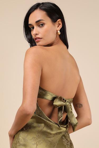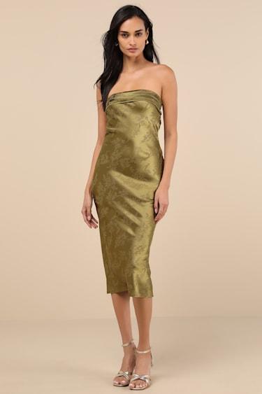 If there is dancing, bubbly, and good friends, then the Lulus Impressive Favorite Olive Jacquard Strapless Midi Dress needs to be there! Sleek woven satin jacquard fabric, with a chic floral design throughout, shapes this slip-style midi dress that features a strapless neckline with a pleated, fold-over trim. A tying detail secures atop the draping, cowl-like open back, lending an alluring finish to the exquisite design. Hidden side zipper.