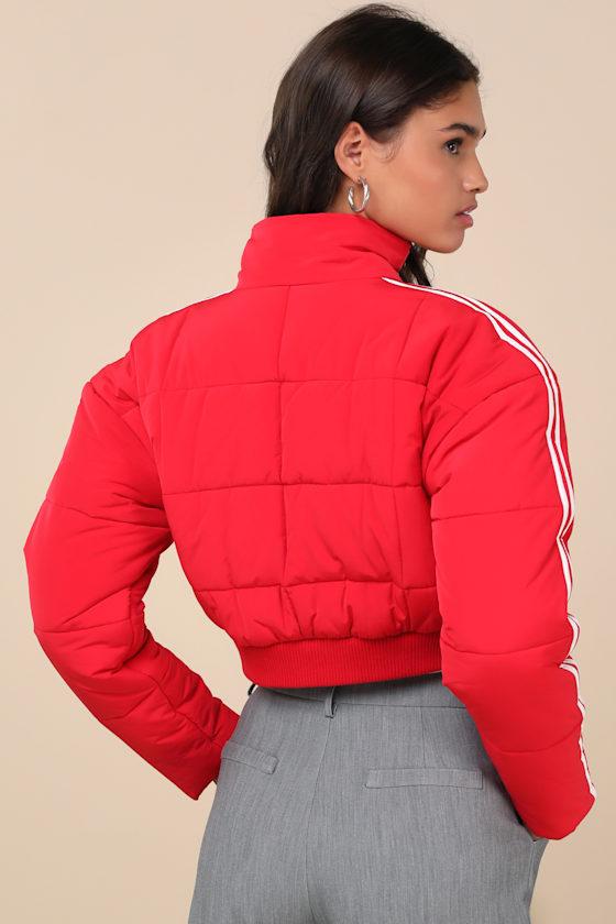 You'll have a knack for staying cozy while looking oh-so cute, thanks to the Lulus Impressively Posh Red Nylon Quilted Cropped Puffer Jacket! Sleek woven nylon shapes this puffy, quilted jacket that features a classic mock neckline and long sleeves with drop shoulders. An exposed silver zipper accents the front of the cropped, wide-cut bodice, along with functional welt pockets at the sides and a fitted, ribbed knit hem. Contrasting white stripes along the sleeves lends an athleisure-inspired finish!