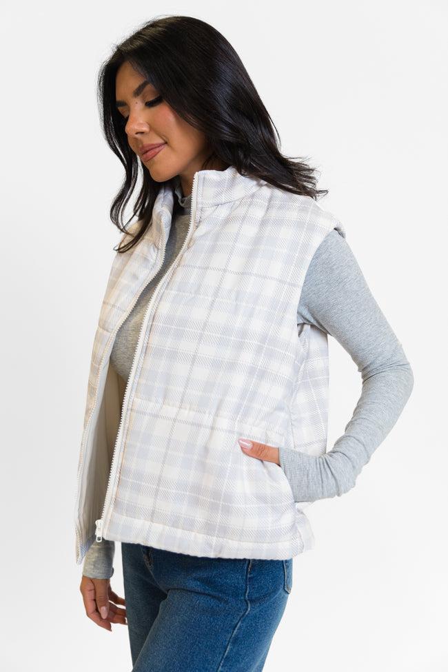 Details Beige Plaid Puffer Vest Fabric has no stretch Collared style, full zip closure, functional pockets Pair this vest over a cute basic long sleeve tee! Lined Size small from shoulder to hem: 19" Material and Care 100% polyester Machine wash cold, no drum drying Patterns may vary Materials may have natural variations Colors may vary from different viewing devices.
