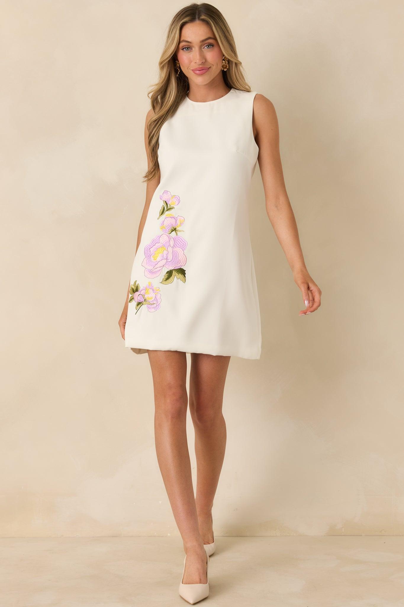 Fresh, feminine, and easy to love, the In Bloom Again Ivory Multi Floral Embroidered Mini Dress brings a timeless floral touch to a clean, classic silhouette. The ivory base keeps things light and refined, while the embroidered blooms add just the right amount of color and charm. It’s the kind of piece that feels special without trying too hard—perfect for spring events, showers, and everything in between. This ivory mini dress features a smooth woven fabric with lavender and pink toned floral embroidery along the front. Designed with a sleeveless silhouette and a crew neckline, it offers a simple, flattering fit. Finished with a hidden back zipper closure and a clean hemline for an easy, polished look.92% Polyester & 8% Spandex Lining: 100% Polyester Hand Wash Cold Manufactured in China Designed in The USAModel is 5'8" and Wearing a Size Small, Clipped, Model is a True X-Small