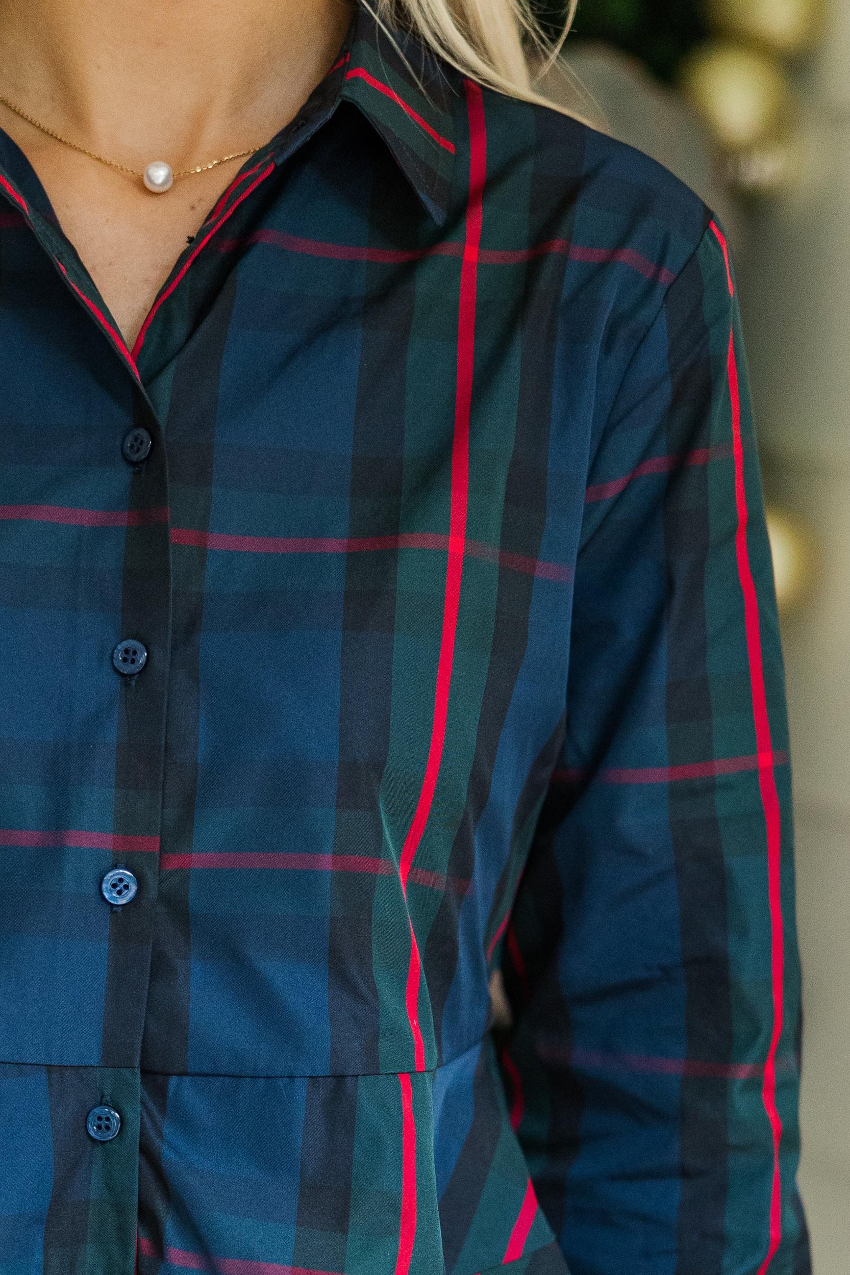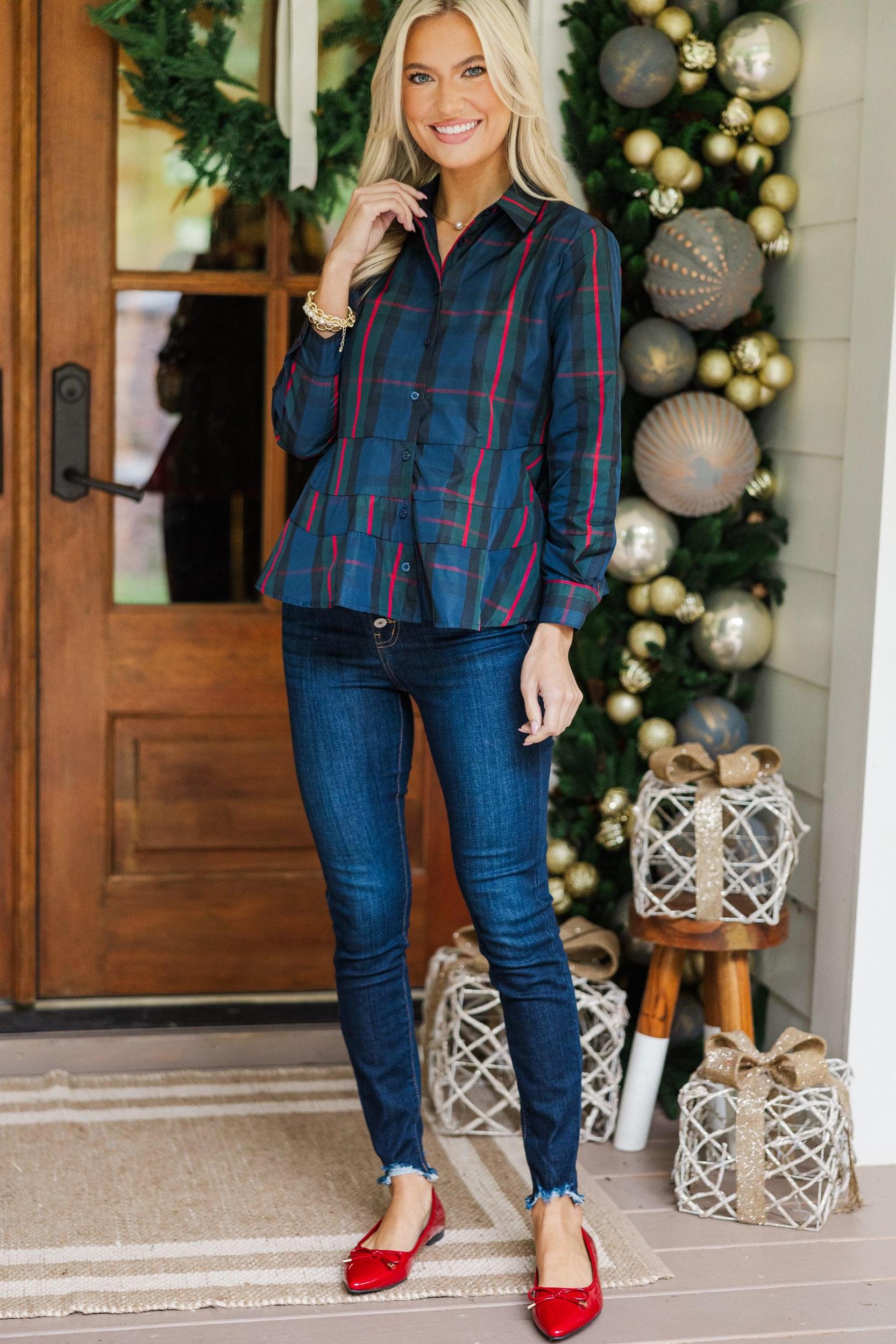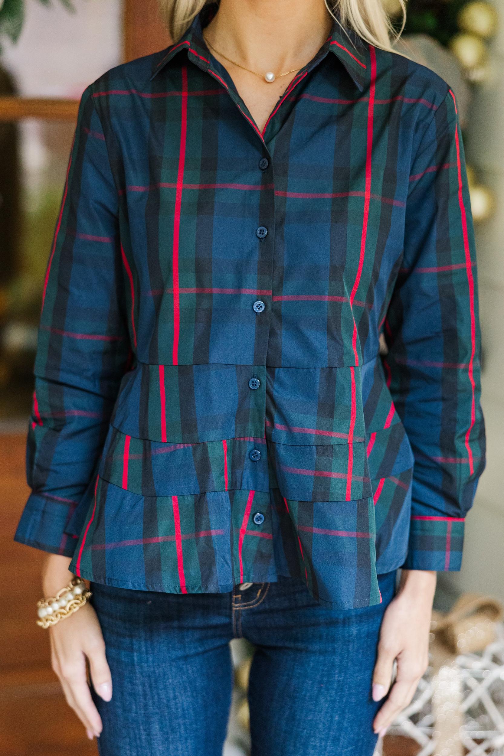 You are going to feel so in control when wearing this blouse! There is just something about that classic fit and festive print! This blouse is going to look great with jeans all season long! Collared neckline Button down front closure Long sleeves Plaid print Peplum hem No stretch Baileigh is wearing the small.
