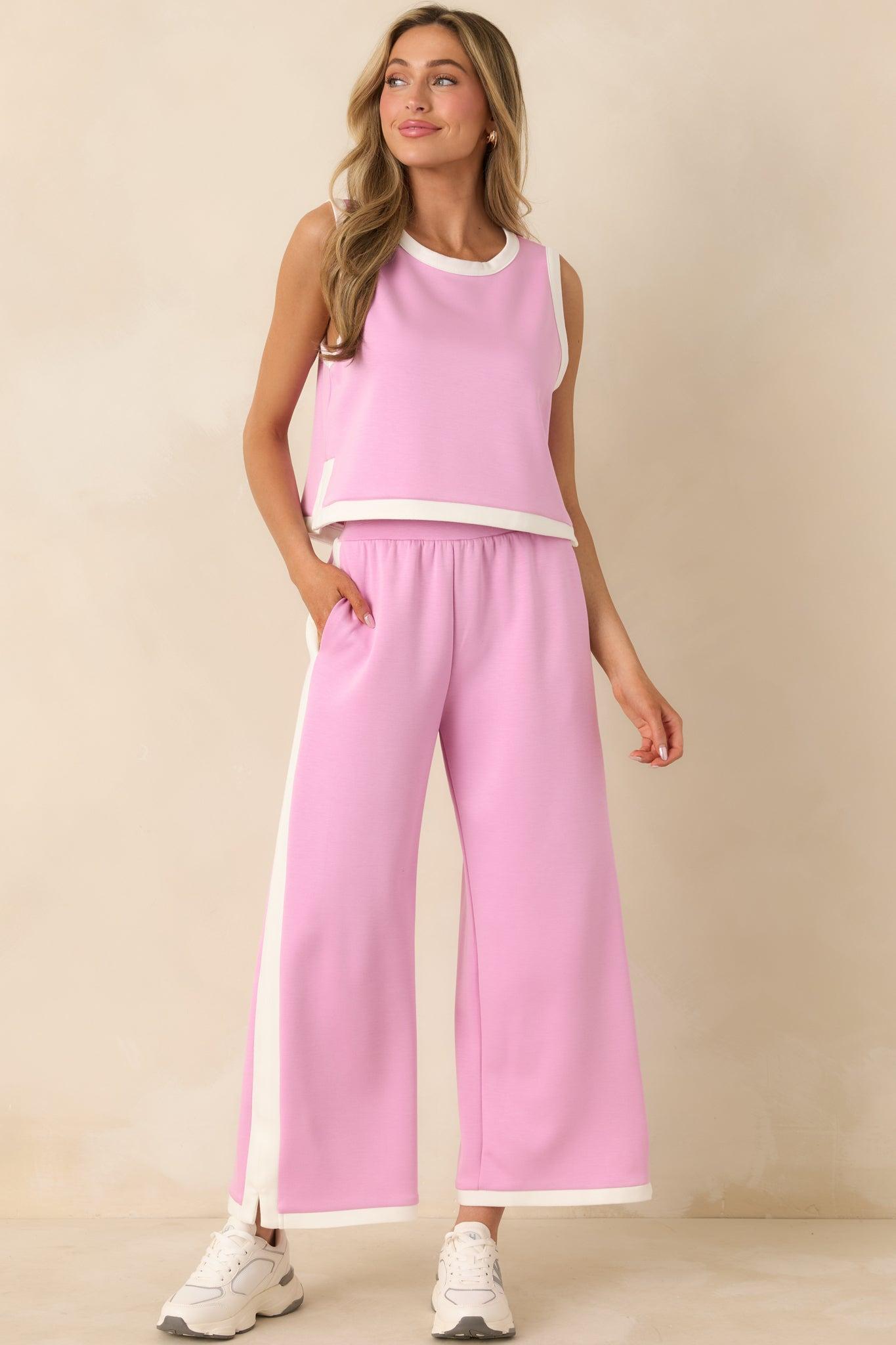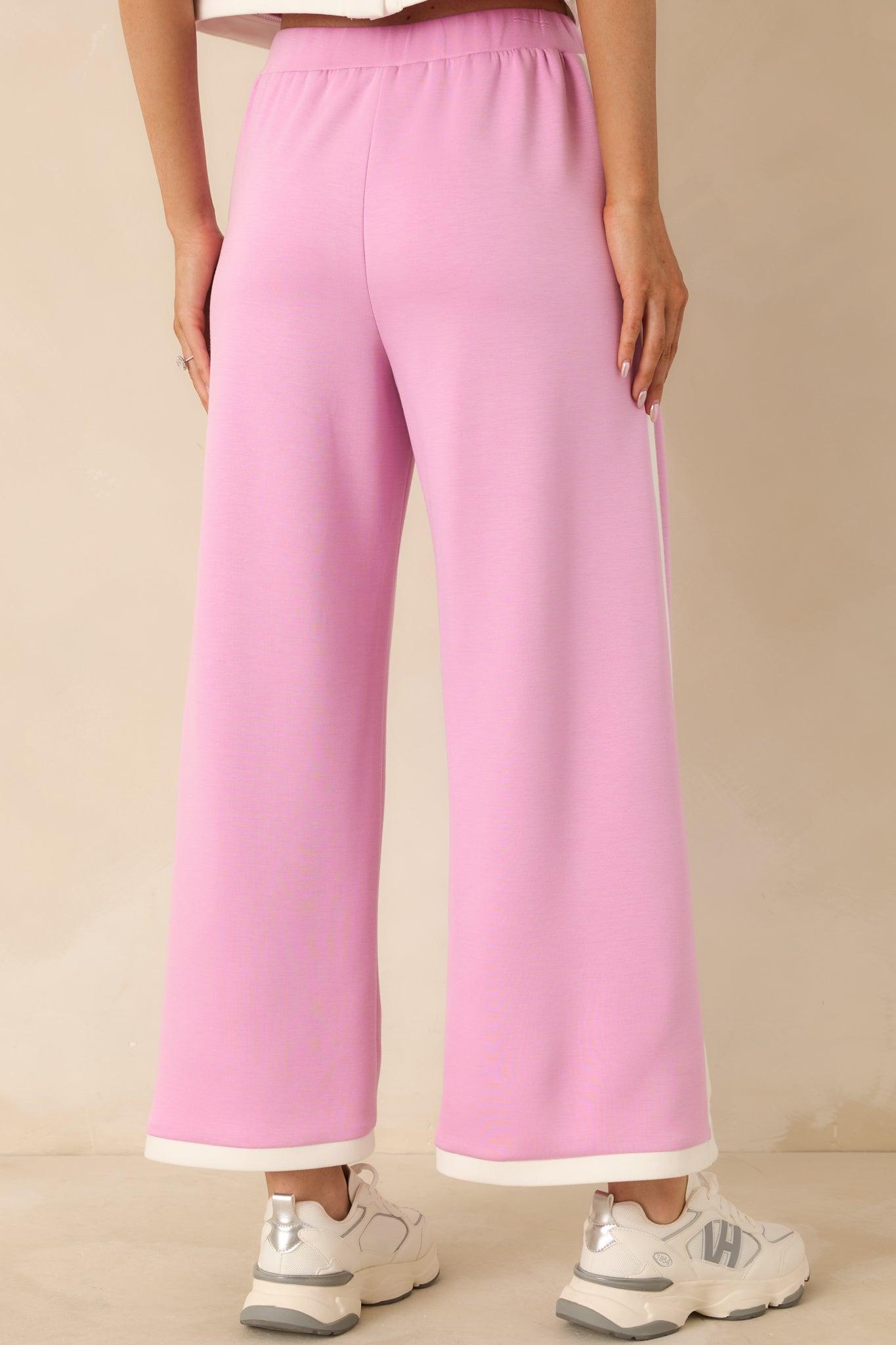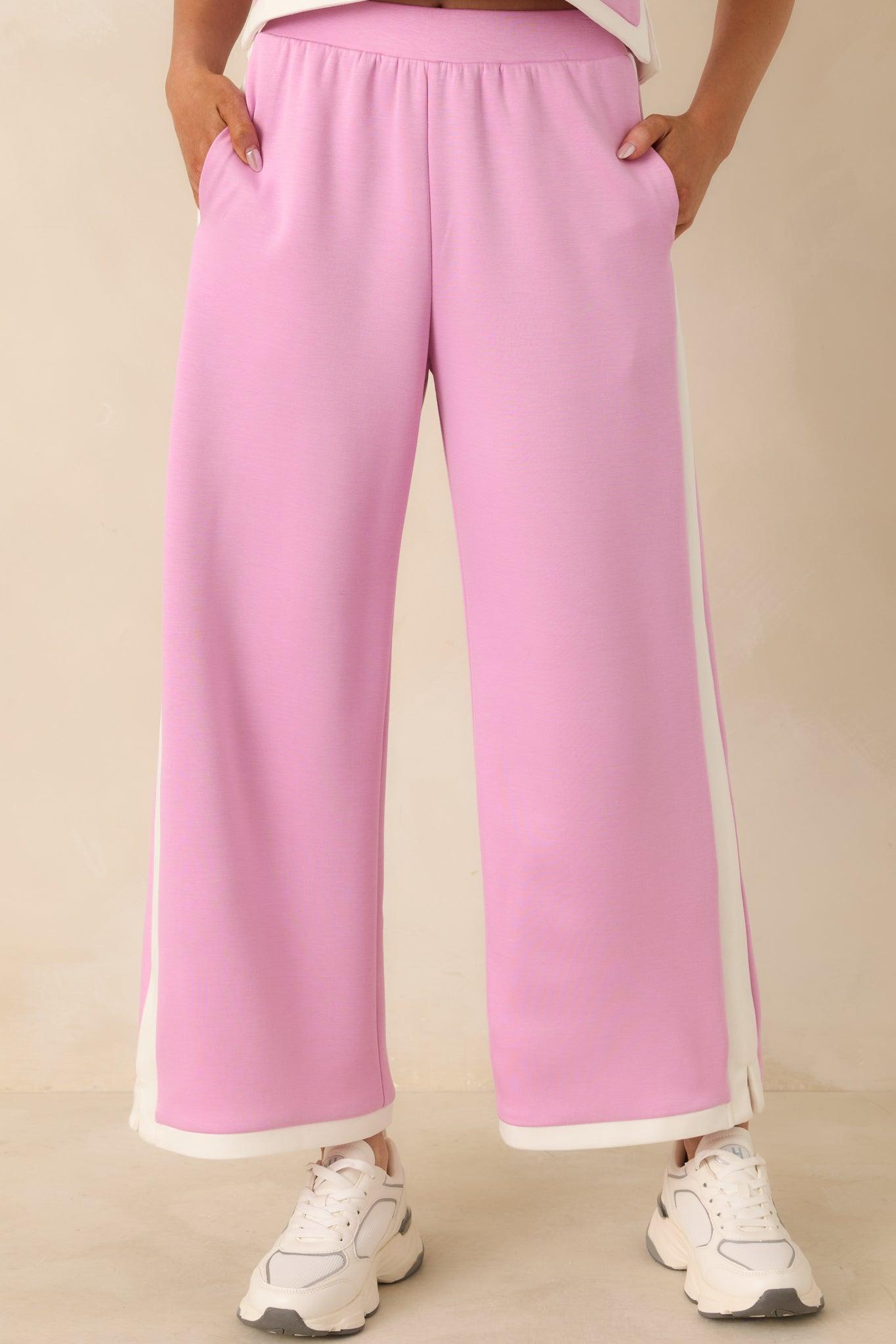 These In Good Form Orchid Pink Stretch Knit Contrast Trim Pants are what happens when comfort meets intention. Designed to move with you while still looking pulled together, they’re the kind of soft staple you’ll reach for on repeat. Easy enough for lounging, polished enough for errands, and perfect paired with the matching top for an effortlessly coordinated moment. These orchid pink stretch knit pants feature a relaxed wide-leg fit with an elastic waistband for comfortable wear. Designed with contrast trim along the sides and hem for a sporty finish. Crafted from a soft, stretchy knit fabric that allows for easy movement and all-day comfort.55% Rayon, 40% Cotton, & 5% Spandex Unlined Hand Wash Cold Manufactured in China Designed in The USAModel is 5'8" and Wearing a Size Small