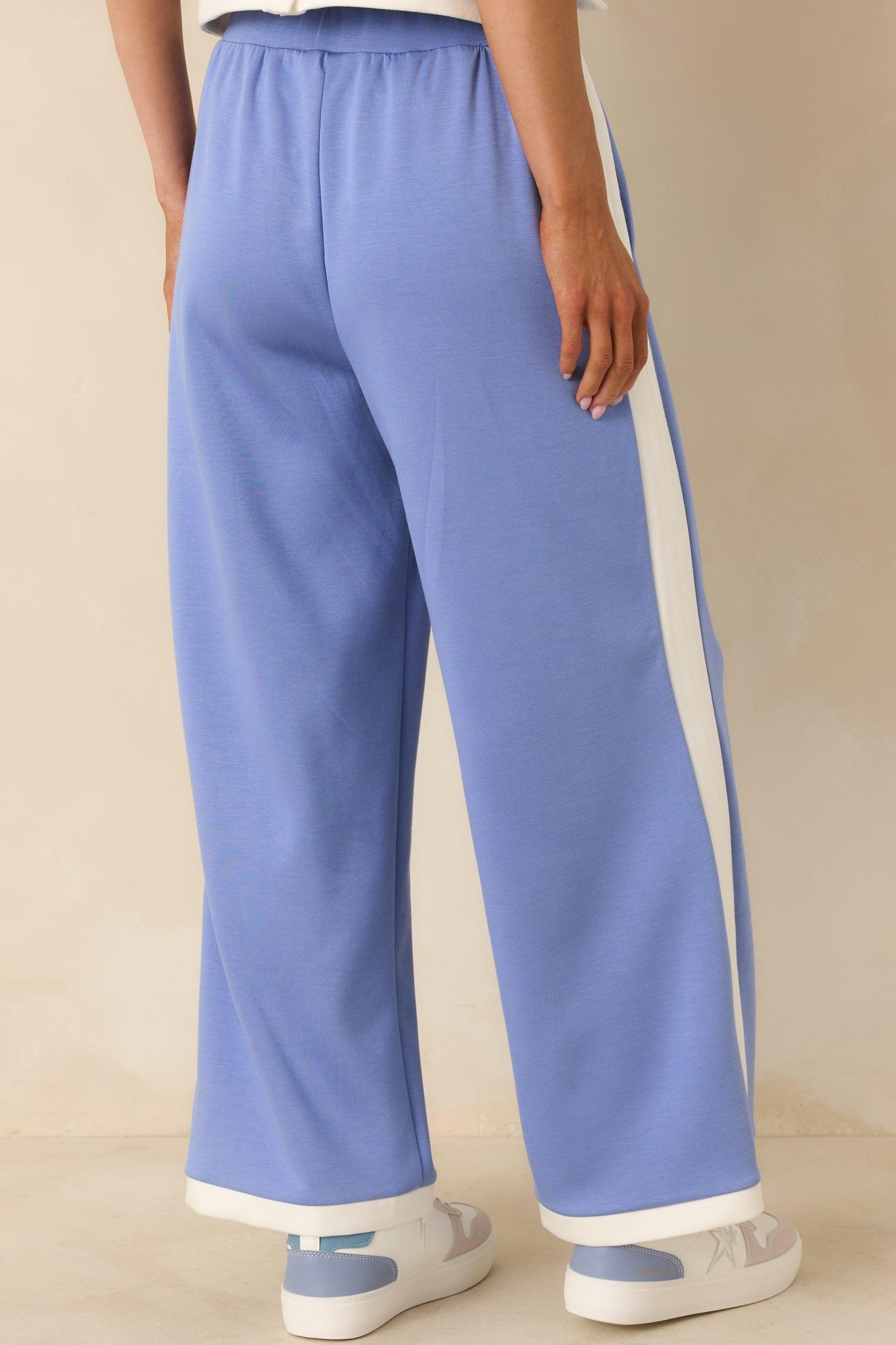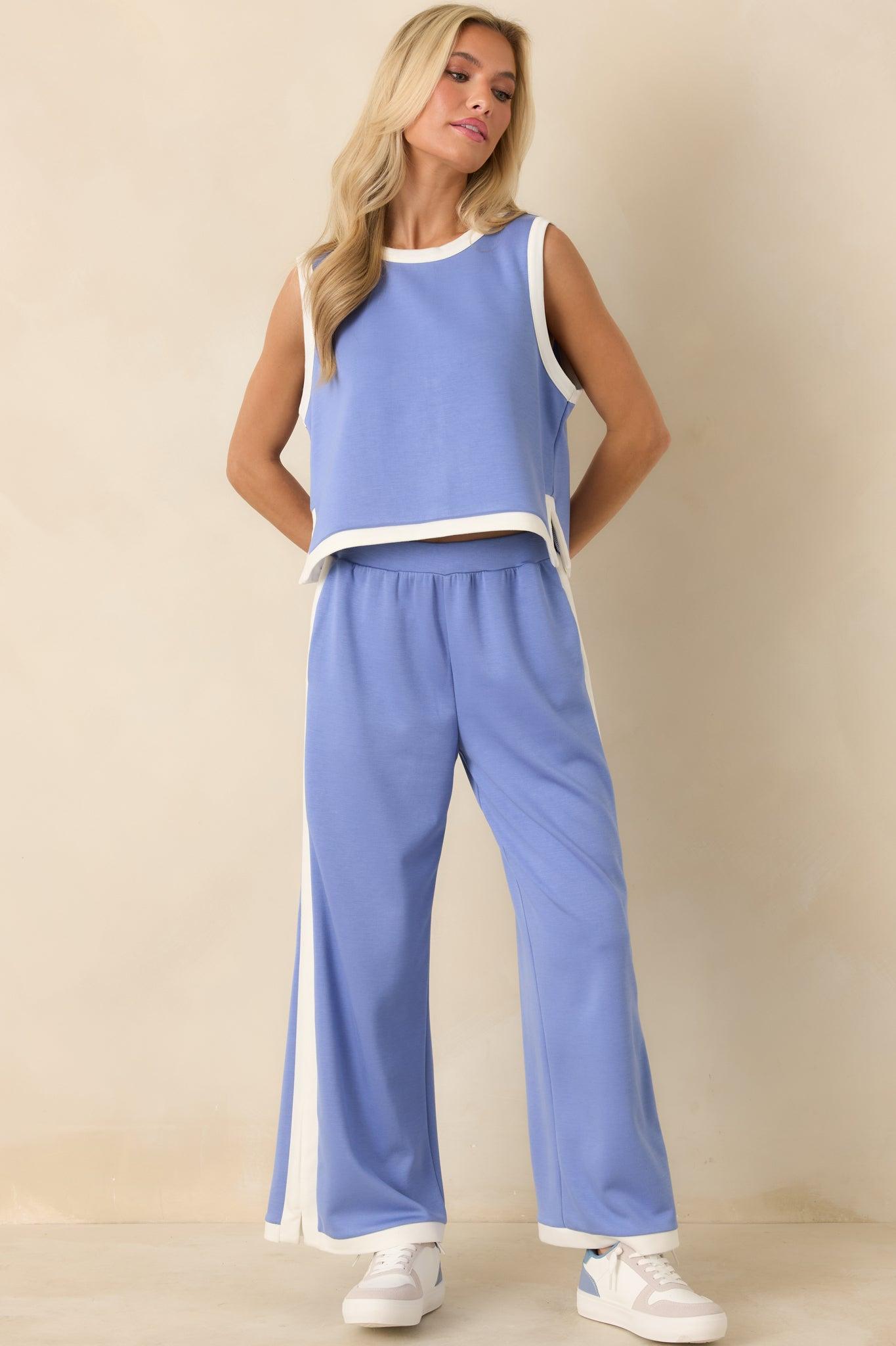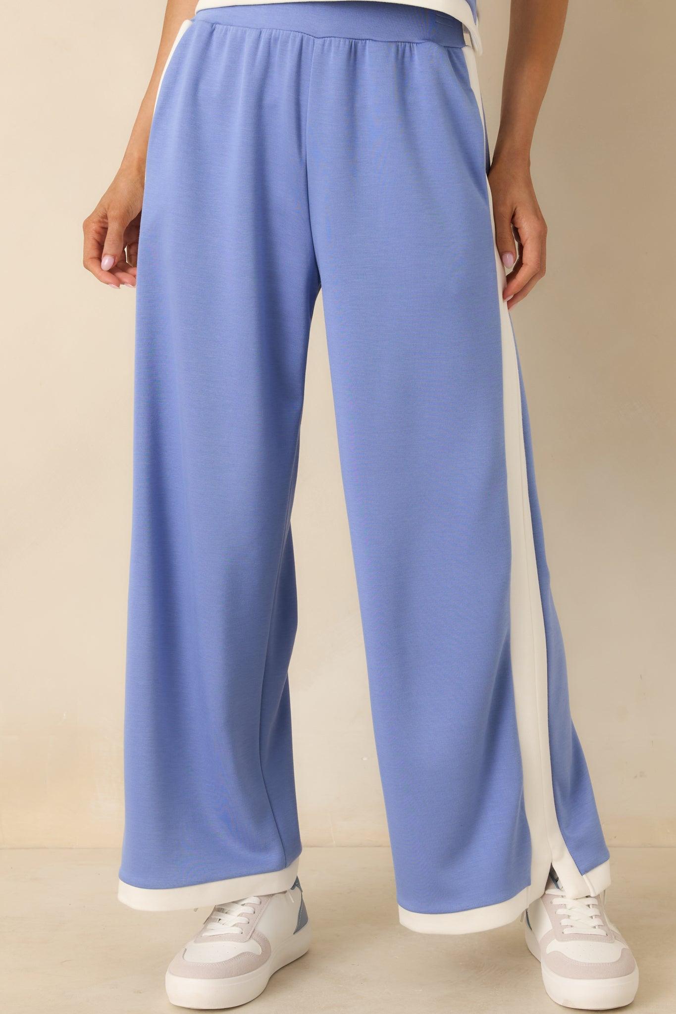 These In Good Form Periwinkle Stretch Knit Contrast Trim Pants are what happens when comfort meets intention. Designed to move with you while still looking pulled together, they’re the kind of soft staple you’ll reach for on repeat. Easy enough for lounging, polished enough for errands, and perfect paired with the matching top for an effortlessly coordinated moment. These periwinkle stretch knit pants feature a relaxed wide-leg fit with an elastic waistband for comfortable wear. Designed with contrast trim along the sides and hem for a sporty finish. Crafted from a soft, stretchy knit fabric that allows for easy movement and all-day comfort.55% Rayon, 40% Cotton, & 5% Spandex Unlined Hand Wash Cold Manufactured in China Designed in The USAModel is 5'8" and Wearing a Size Small