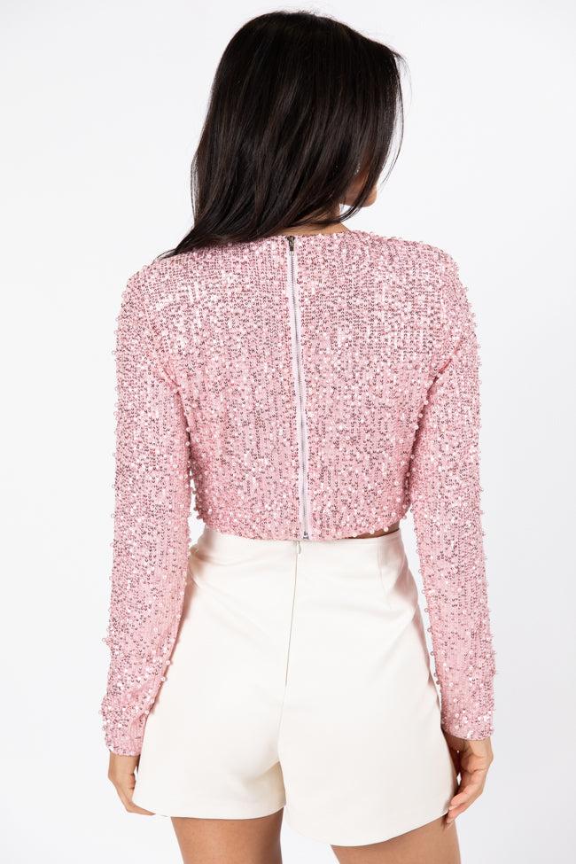 Detail Pearl And Sequin Embellished Crop Blouse Fabric is very stretchy Crew neckline with bubble hem and pearl detailing, has shoulder pads Pair this top with dressy pants and heels! Lined Size small from shoulder to hem: 13" Material and Care 100% polyester Hand wash cold, lay flat to dry Patterns may vary Materials may have natural variations Colors may vary from different viewing devices.