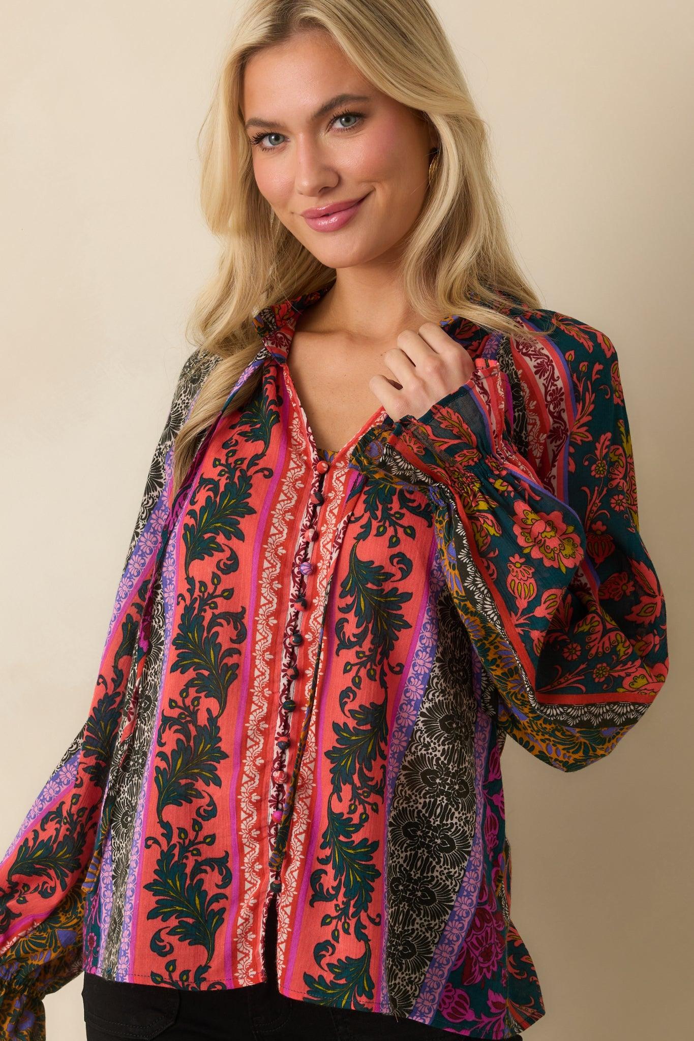 The In Her Own Way Dark Teal Multi Patchwork Print Cotton Blouse has an artsy, free-spirited charm, bringing a unique mix of color and pattern that feels confident, creative, and effortlessly stylish. This dark teal blouse features a multicolor patchwork print, a notched V-neckline with optional self-ties, a functional button-front closure, long sleeves with elastic cuffs, and ruffle trim details. 100% Cotton Unlined Hand Wash Cold Manufactured in China Designed in The USA Model is 5'6" and Wearing a Size Small