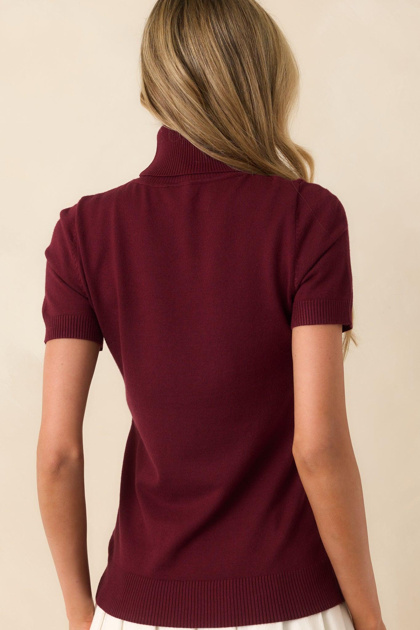 The In Just A Minute Wine Ribbed Turtleneck Short Sleeve Sweater is perfect for those almost-out-the-door moments. It’s polished without feeling too serious and always makes it look like you had more time to get ready than you did. This wine red sweater features a ribbed knit fabric, a rolled turtleneck, short sleeves, a slightly fitted design, and ribbed hems.