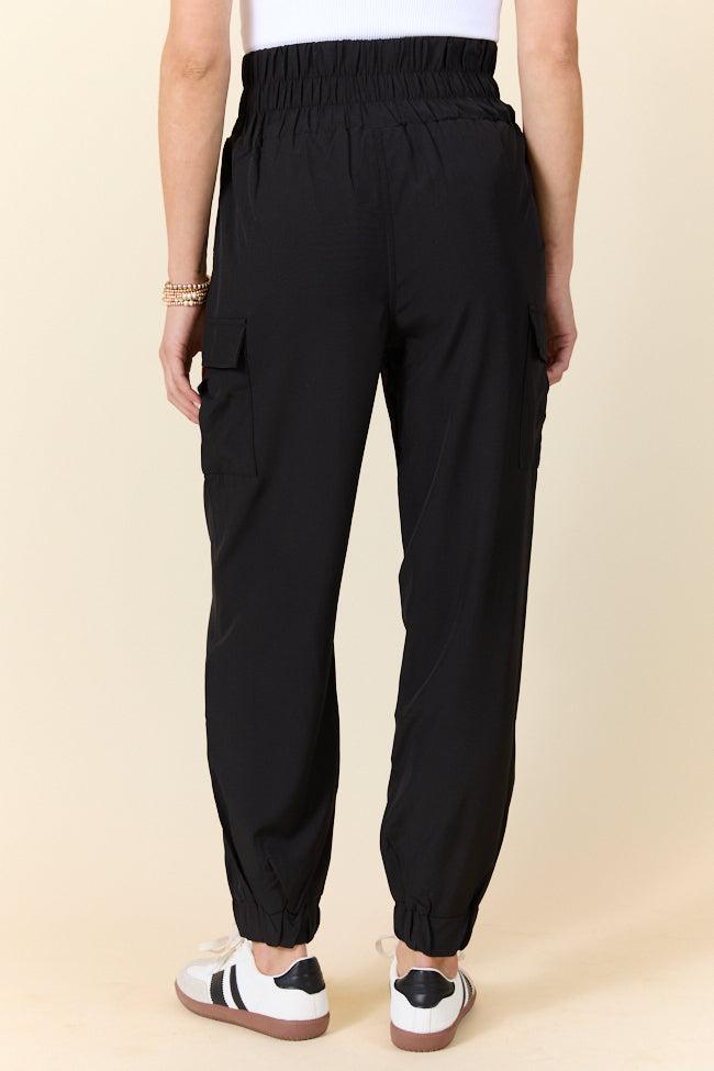 Details Black Cargo Active Pants Fabric has stretch Elastic waistband, functional pockets, Unlined Size small inseam: 26" Material and Care 95% polyester 5% spandex Machine wash cold, line dry Patterns may vary Materials may have natural variations Colors may vary from different viewing devices.