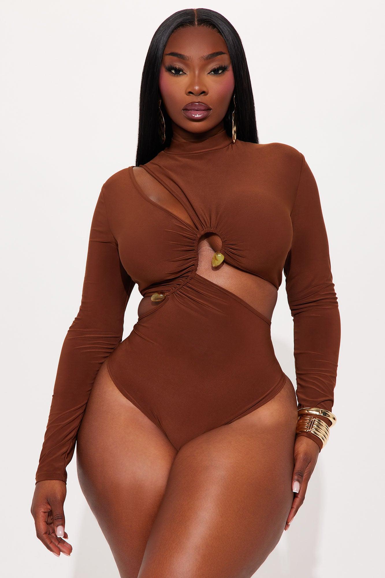 Available In Chocolate. Bodysuit High Neck Long Sleeve Cut Out Ruched Hardware Cheeky Bottom Snap Closure Stretch Final Sale Self: 95% Polyester 5% Spandex Imported California Proposition 65WARNING: Cancer and Reproductive Harm - www.P65Warnings.ca.gov.