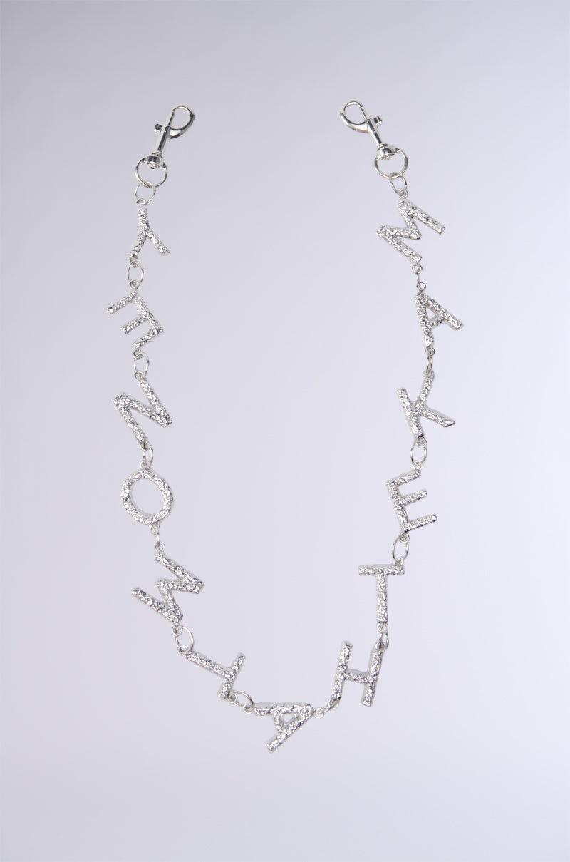 Announce your bo$$ babe status with The AKIRA Label In My Bag Pant And Purse Chain. This cheeky chain is crafted from a silver metallic base and spells out “make that money” in all caps. Complete with swivel snap hooks. Attach it to your belt loops or your purse straps to make a statement! - 100% Man-Made Materials- Imported (all measurements approximate from size O/S) - 25” LengthProduct ID: 441205