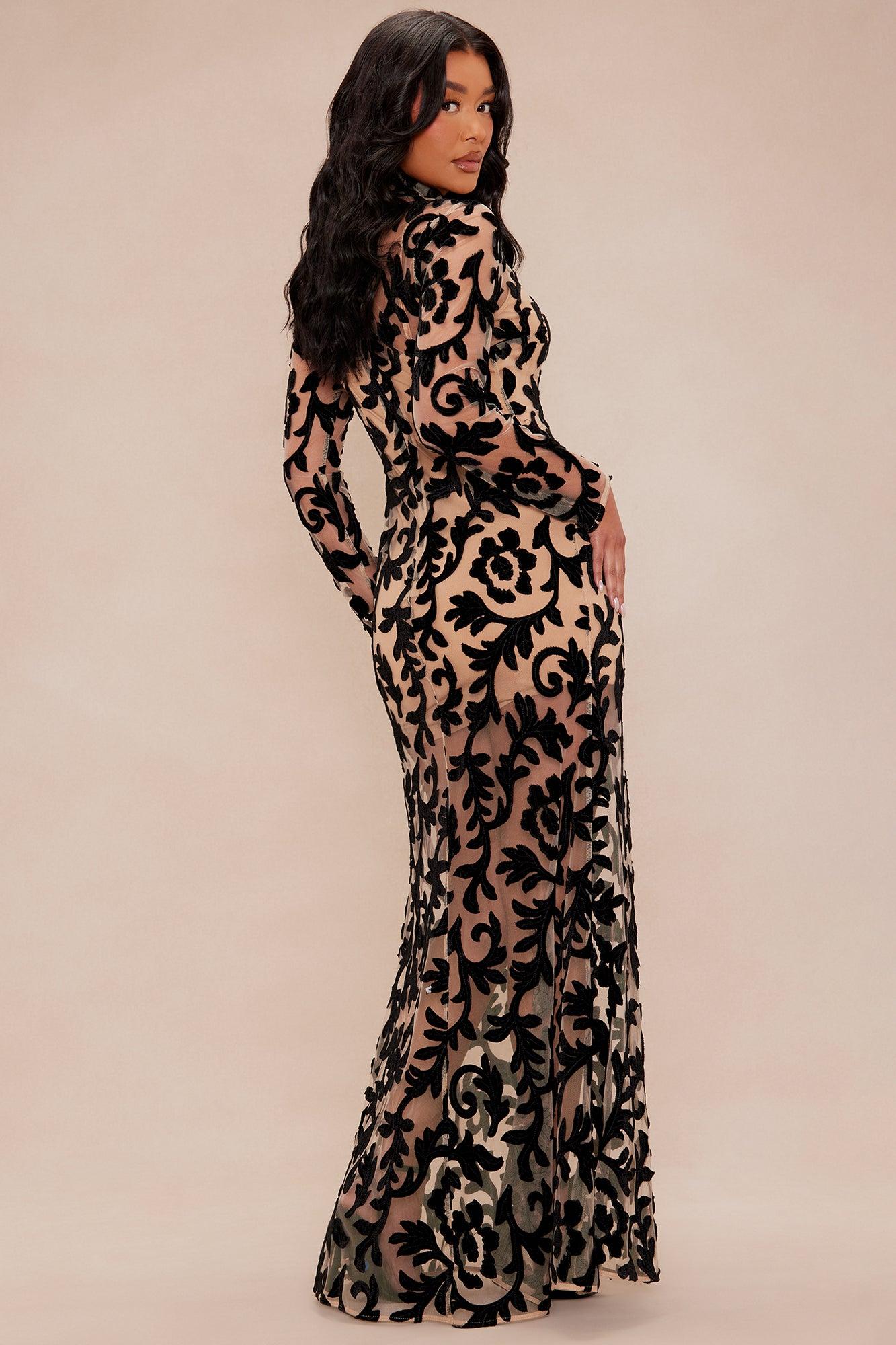 Available In Nude/combo. Maxi Dress Mock Neck Button Closure Long Sleeves Backless Back Zipper Closure Flocked Non Stretch Disclaimer: Placement Of Burnout Will Vary. Main: 100% Polyester Lining: 95% Polyester 5% Spandex Imported