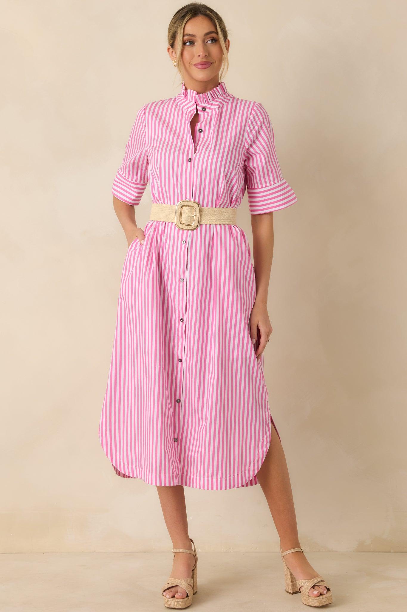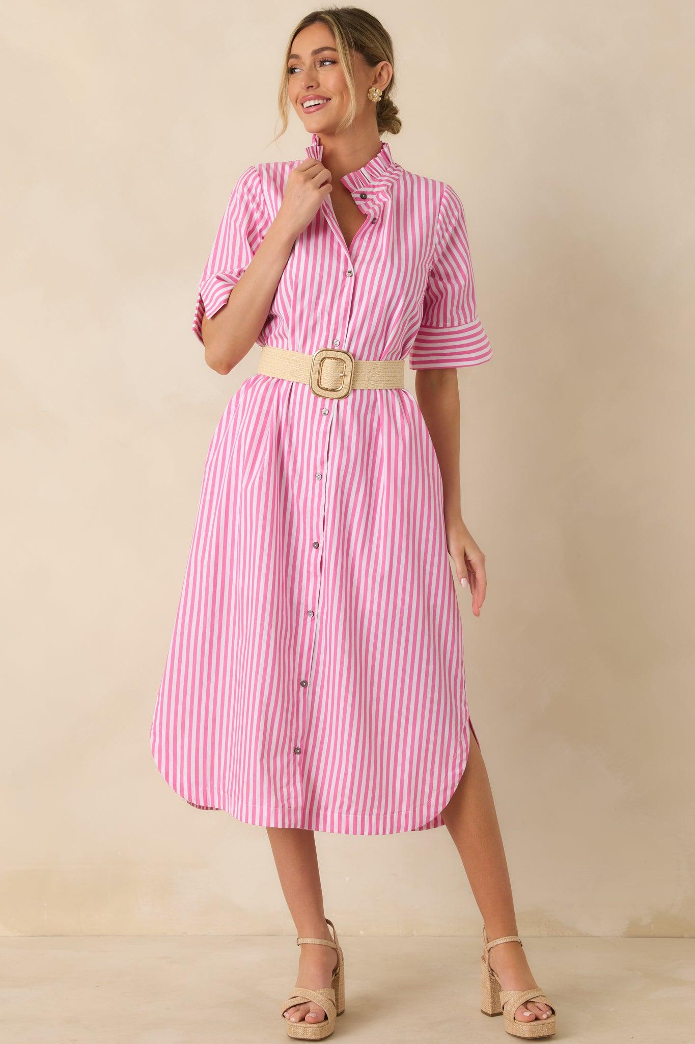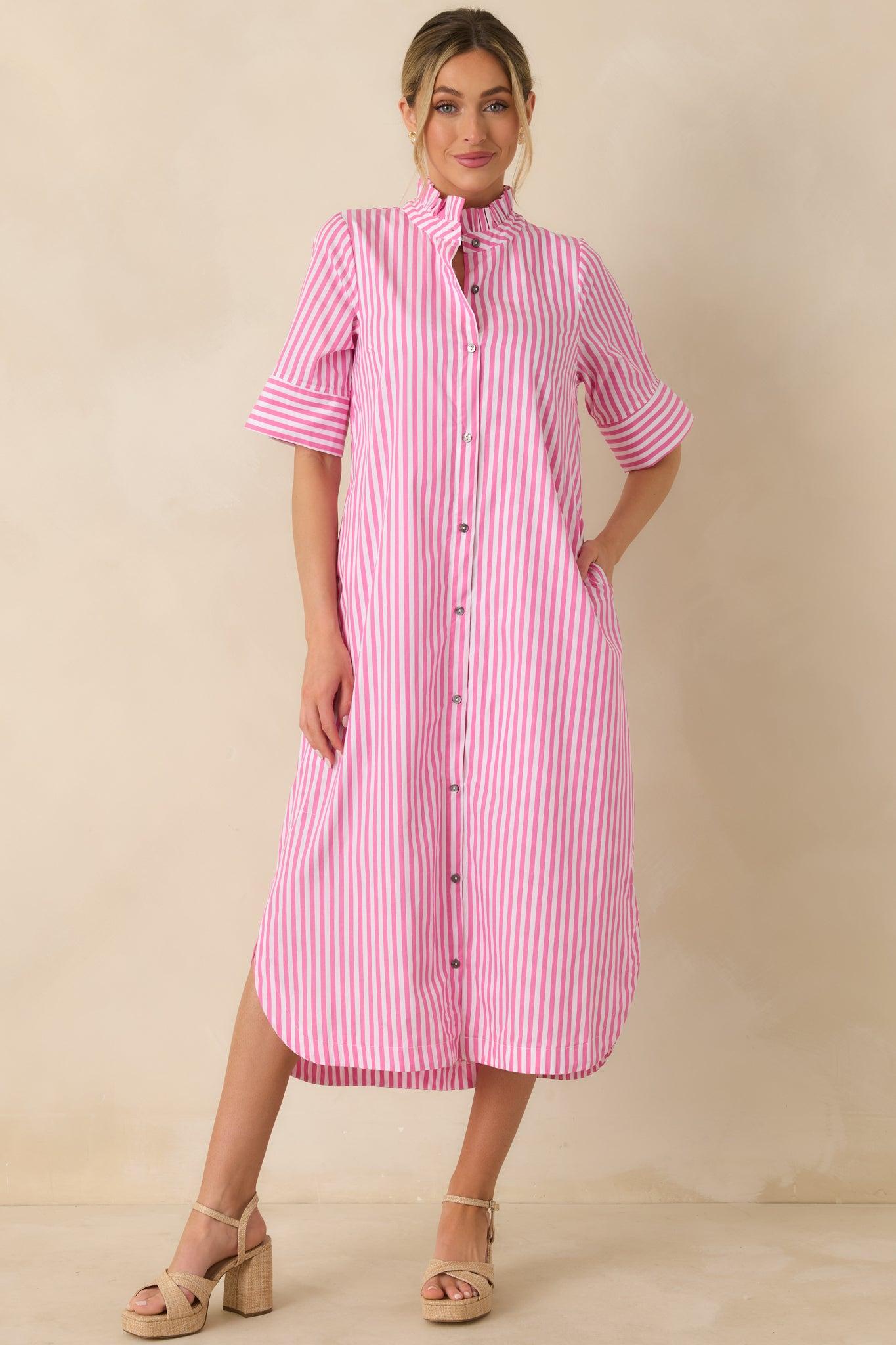 Classic stripes meet an easy, feminine silhouette in the In Perfect Order Pink Stripe Button Front Ruffle Collar Midi Shirt Dress. The ruffle collar adds just the right amount of charm, making this one feel polished without trying too hard—perfect for days when you want to look put-together with minimal effort. This pink striped shirt dress features a lightweight woven fabric with a button-front closure and a softly ruffled collar. Designed with short sleeves and a relaxed, flowy fit through the skirt, it hits at a midi length with a shirttail hemline for an easy, flattering shape. Finished with vertical stripes that elongate the look and a breathable feel that works season to season. 100% Polyester Lined Hand Wash Cold Manufactured in China Designed in The USA Model is 5'8" and Wearing a Size Small, Clipped, Model is a True X-Small