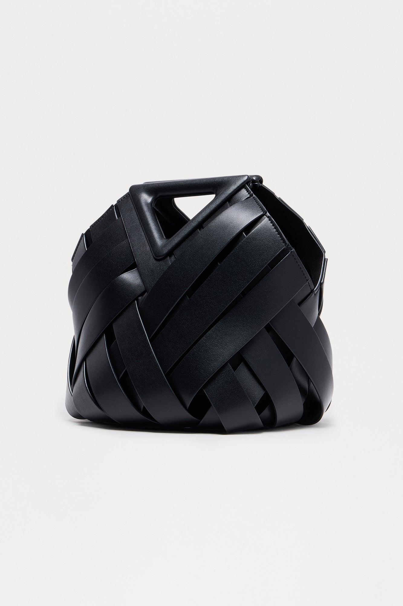 Available In Black. Crossbody Bucket Handbag Faux Leather Removeable Pouch Insert Removeable Strap Woven Detail Dimensions: 11x10x4" Self: 100% PU Imported