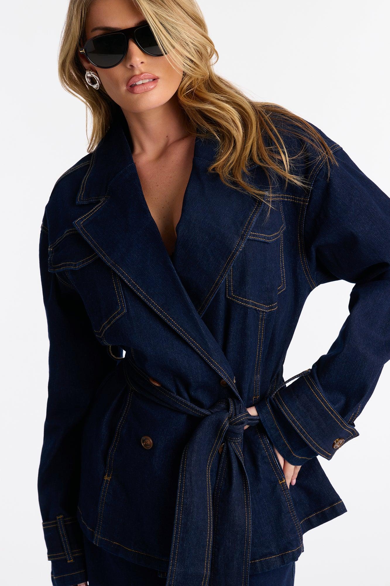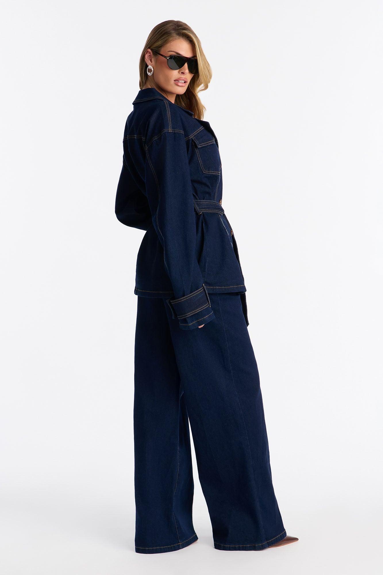 Available In Dark Wash. 2 Piece Ensemble Blazer And Pant Set Moderate Stretch Long Sleeve Front Tie Pockets Wide Leg 34" Inseam Disclaimer: Due To The Specialized Wash Process, Each Garment Is Unique. Shell : 85% Cotton 13% Polyester 2% Spandex Imported