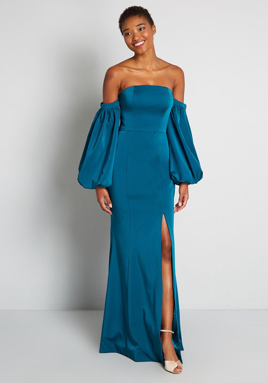 With vintage inspiration and a gorgeous silhouette, this teal blue maxi dress from Aussie brand Bariano is a true showstopper! Made from a drapey woven fabric with a subtle sheen, this elegant evening gown boasts a sleeveless fitted bodice that is structured by boning at the back, slides, and bust and then further reinforced by a non-slip bust strip. The floor-length skirt has a subtle A-line flare and a sassy mid-thigh side slit, and this gorgeous formal dress is made truly unique when you include the removable, off-the-shoulder balloon sleeves that secure with button closure. *Please note: Australian brands have their own sizing, so be sure to check the sizing conversion chart to ensure a perfect fit! Shell: 93% Polyester, 7% Spandex Lining: 97% Polyester, 3% Spandex Hand wash Fully lined Back zipper with hook and eye closure Padded bust. Boning at back, sides and bust Non-slip bust strip Removable sleeves with button closure Imported Fabric does not provide stretch 4=61.5 inches Length