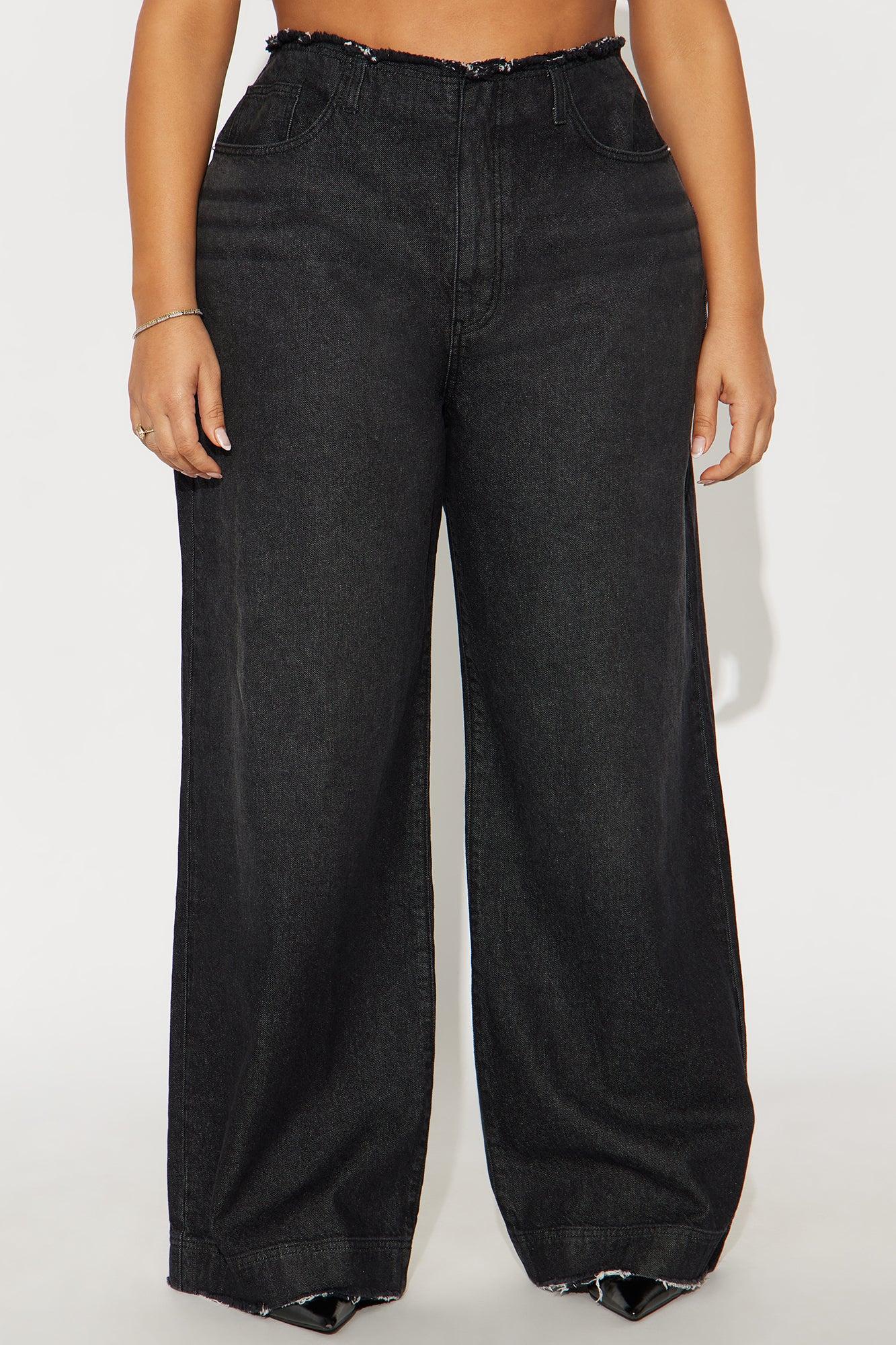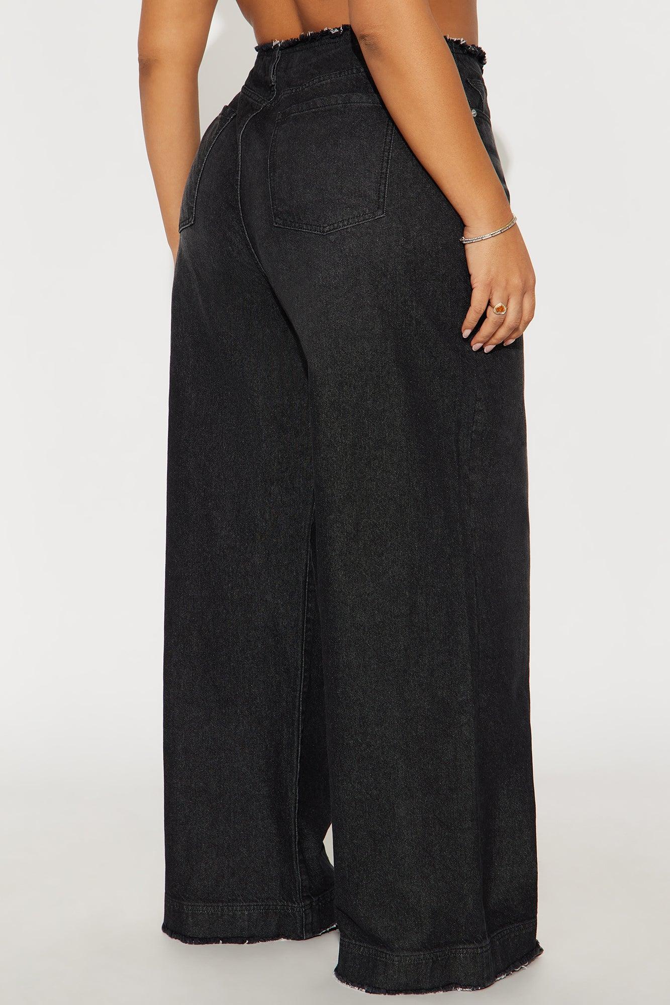 Available In Black Wash And Medium Wash. Wide Leg Jean 5 Pocket Cut Off Waistband Raw Cut Hem 32" Inseam 11.5" High Rise Non-Stretch Disclaimer: Due To The Specialized Wash, Each Garment Is Unique. 100% Cotton Imported