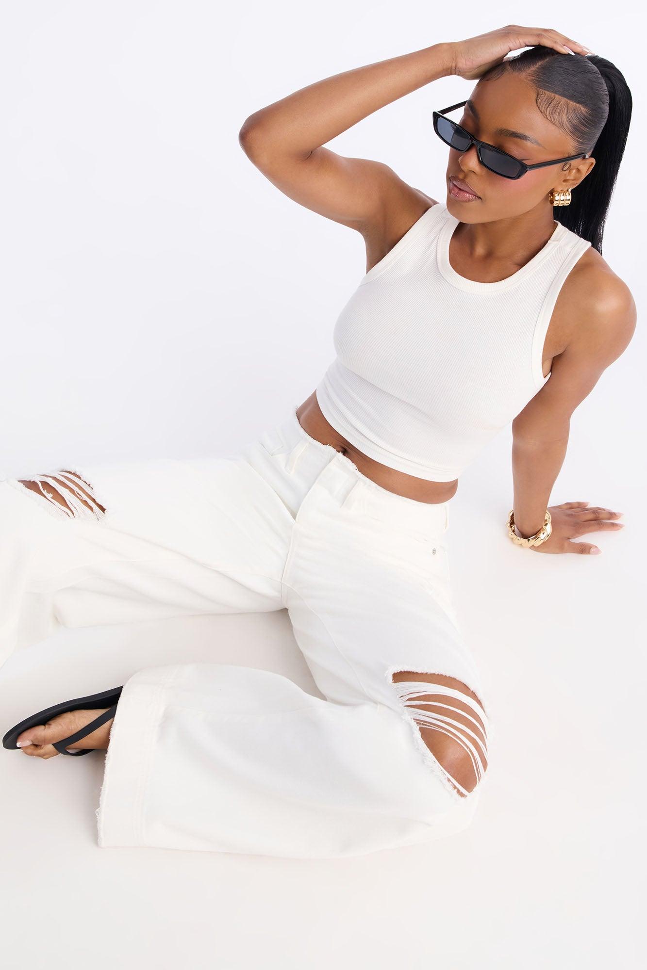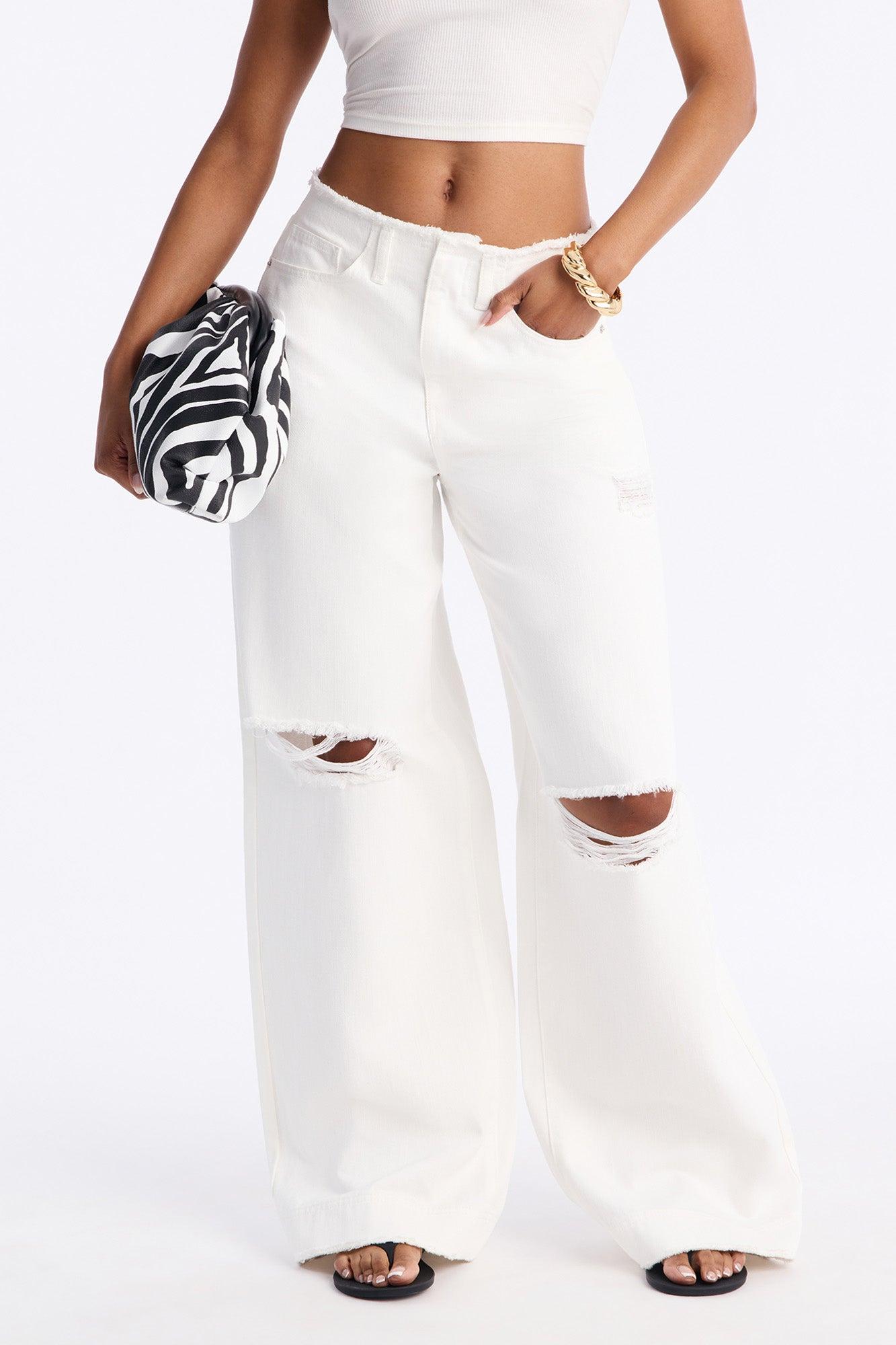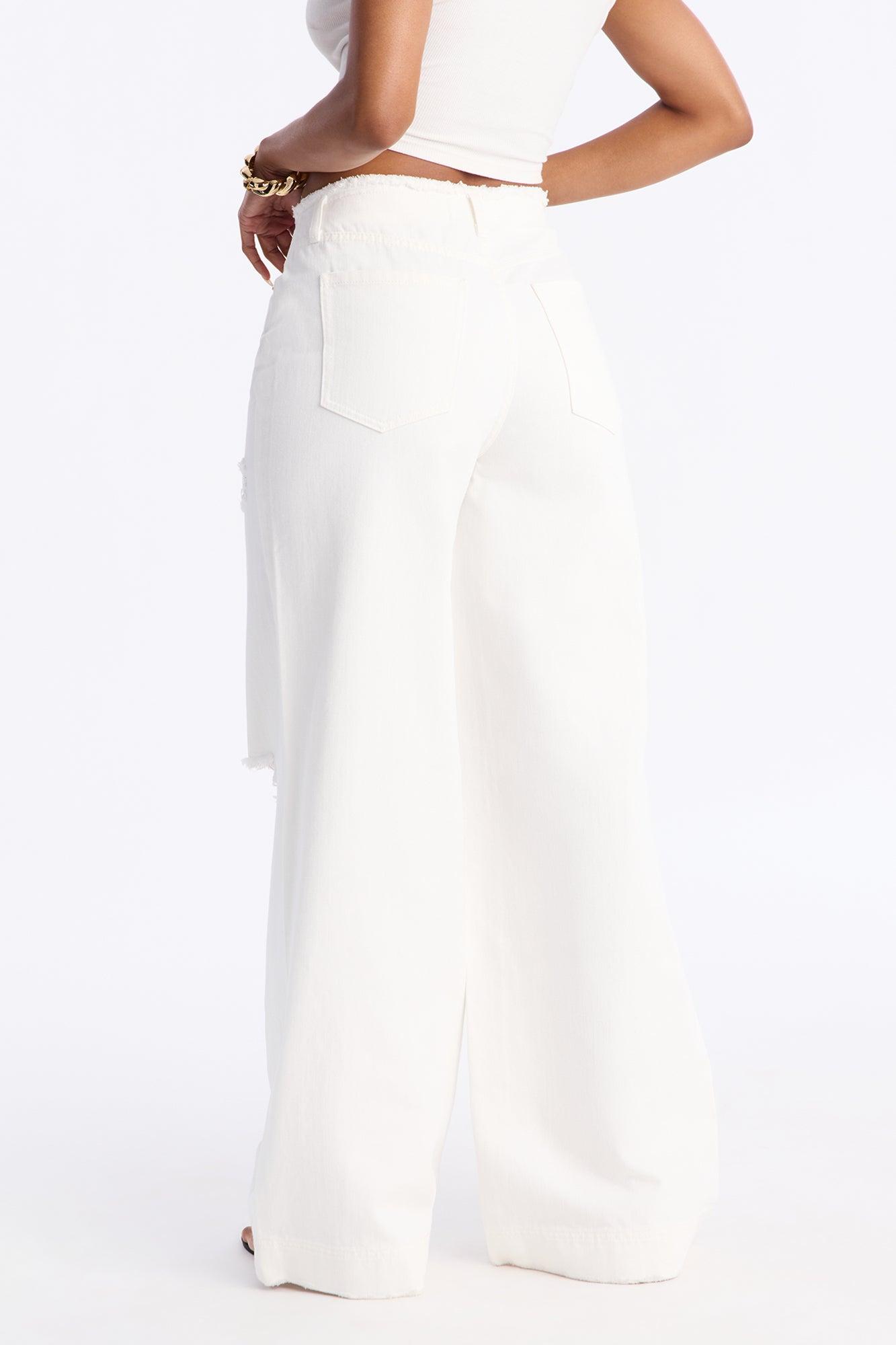 Available In Medium Wash And White. Wide Leg Jean 5 Pocket Cut Off Waistband Raw Cut Hem Knee Destruction 32" Inseam 11.5" High Rise Non-Stretch Disclaimer: Due To The Specialized & Distressing Wash Process, Each Garment Is Unique. 100% cotton Imported