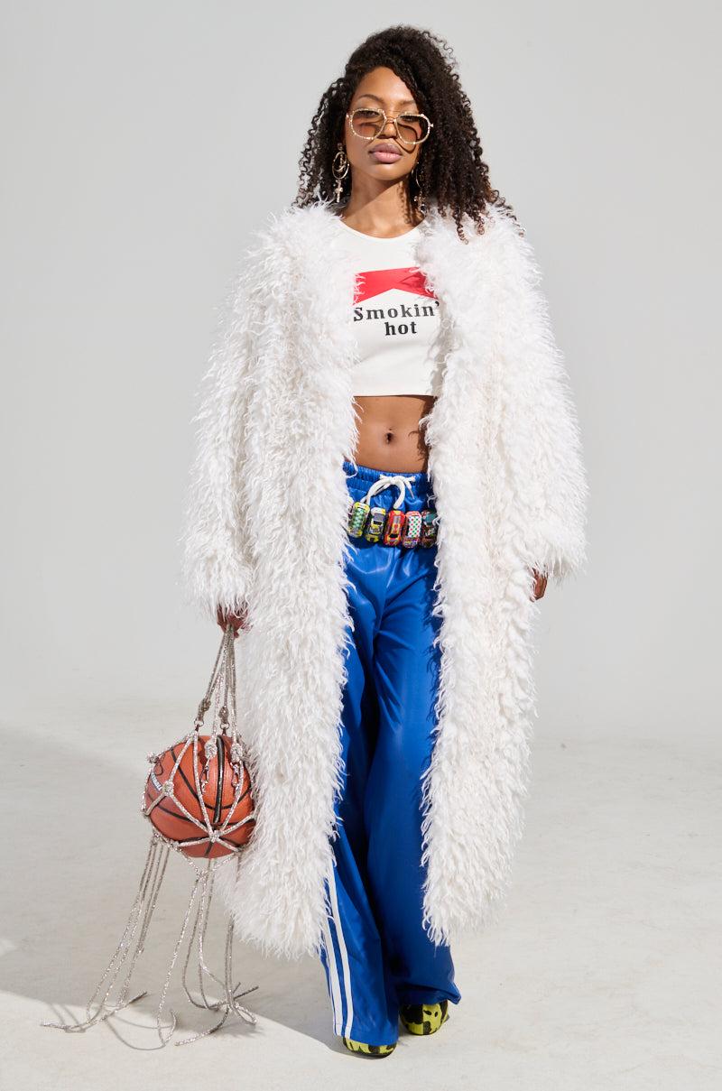 Bring the drama in The AKIRA Label Ina Mohair Fur Trench. This luxurious outerwear piece is crafted from a bold shaggy mohair base and features a rounded neckline, long sleeves, concealed hook-and-eye front closures, a sleek inner lining, and a longline silhouette. Style with flared denim and leather booties to strut the streets in style. - Shell: 100% Polyester, Lining: 100% Polyester- Dry Clean Only- No Stretch (all measurements approximate from size S/M)- 47” Shoulder to Hem- 23” Sleeves- 18” Shoulder to ShoulderProduct ID: 433357 (all measurements approximate from size 1X/2X)- 50” Shoulder to Hem- 26” Sleeves- 21” Shoulder to ShoulderProduct ID: 433359