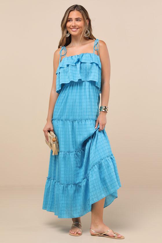 Live easy all summer long in this breezy woven dress, designed for warm temps and day plans. A textured, tonal plaid pattern adorns the tiered silhouette that falls from tying shoulder straps into a flouncy bodice with an elasticized waist, all atop an A-line maxi skirt with ruffled details.