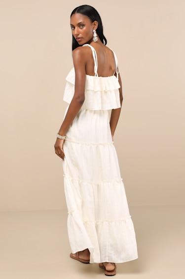 Live easy all summer long in this breezy woven dress, designed for warm temps and day plans. A textured, tonal plaid pattern adorns the tiered silhouette that falls from tying shoulder straps into a flouncy bodice with an elasticized waist, all atop an A-line maxi skirt with ruffled details.